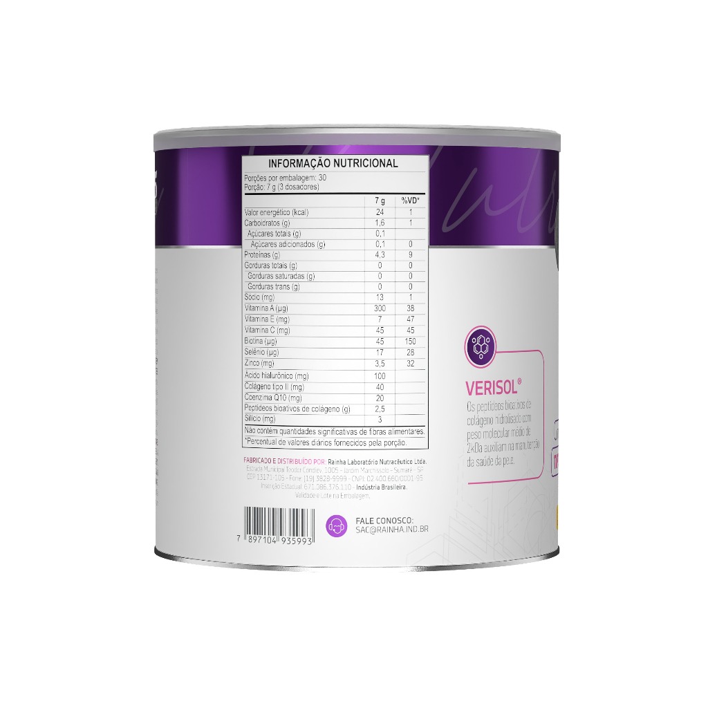 COLÁGENO TRI-PLUS Ingredientes (Sabor Manga com Maracujá): Peptídeos bioativos de colágeno hidrolisado com peso molecular médio de 2kDa VERISOL, Colágeno hidrolisado, Maltodextrina, Ácido hialurônico (Hialuronato de Sódio obtido pela fermentação de Streptococcus zooepidemicus), Colágeno tipo II (Colágeno de frango com colágeno tipo II não desnaturado), Vitamina C (Ácido ascórbico), Coenzima Q10, Silício (Ácido ortosilícico estabilizado em cloreto de colina), Vitamina E (Acetato de DL-alfa-tocoferol), Zinco (Sulfato de zinco monoidratado), Vitamina A (Acetato de retinol), Biotina (D-biotina), Selênio (Selenito de sódio), Aromatizantes sintéticos idênticos aos Naturais, Acidulante Ácido cítrico, Edulcorante Glicosídeos de esteviol (Stevia rebaudiana) e Corante Natural Urucum. NÃO CONTÉM GLÚTEN. NÃO CONTÉM LACTOSE. ALÉRGICOS: PODE CONTER LEITE E SOJA*. *Produzido em equipamento onde se processam também estes alimentos, contudo, ações preventivas de limpeza são adotadas para evitar essa ocorrência. Modo de Preparo: Diluir 7 g (aproximadamente 3 dosadores cheios) em 100 ml (1 copo americano) de água ou bebida de sua preferência, mexendo até completa dissolução. Pode ser consumido quente ou frio. Evite utilizar água fervente. Sugestão de Uso: Consumir 1 (uma) porção 1 (uma) vez ao dia. PRODUTO INDICADO PARA MAIORES DE 19 ANOS. Conservação: Manter em local fresco, não úmido e ao abrigo da luz. Não consumir o produto se o lacre de proteção estiver violado. Após aberto, consumir preferencialmente em 60 dias. Advertências: ?ESTE PRODUTO NÃO É UM MEDICAMENTO?. ?NÃO EXCEDER A RECOMENDAÇÃO DIÁRIA DE CONSUMO INDICADA NA EMBALAGEM?. ?MANTENHA FORA DO ALCANCE DE CRIANÇAS?. ?ESTE PRODUTO NÃO DEVE SER CONSUMIDO POR GESTANTES, LACTANTES E CRIANÇAS?. Apresentação: Lata com 210g