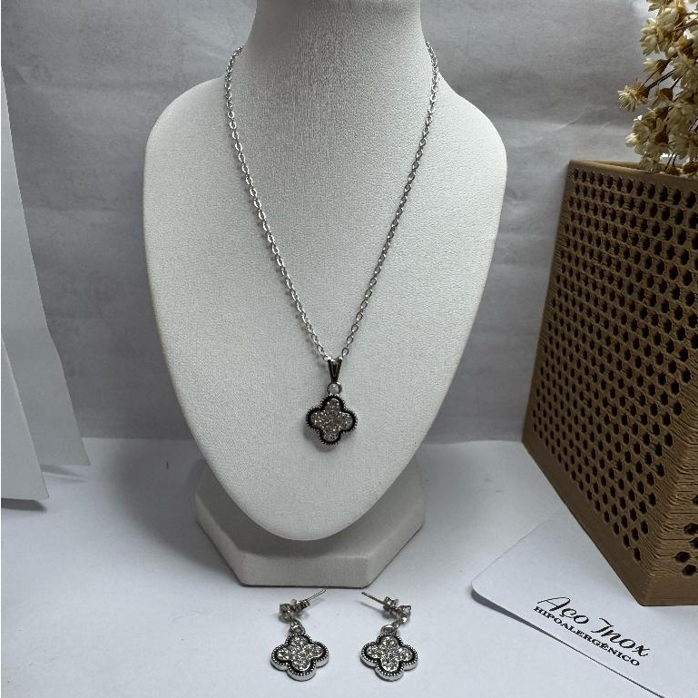 KIT COLAR + PAR DE BRINCOS FLOR COM STRASS Realce seu estilo com este lindo kit composto por um colar elegante e um par de brincos no formato de flor com pedrinhas de strass brilhantes. Um acessório versátil, delicado e perfeito para qualquer ocasião. Detalhes do produto: • Material: Aço inoxidável (resistente à oxidação e durável) •💎 Acabamento: Detalhes em strass brilhante • 🌹Formato: Flor de quatro pétalas com bordas detalhadas • Brincos com fecho de pressão, seguros e confortáveis • Ideal para presentear ou compor looks delicados e sofisticados Tamanho aproximado: colar 21 cm, pingente 2 cm Vantagens: • Não escurece com facilidade • Estilo moderno e feminino • Acompanha colar + brincos combinando • Pode ser usado no dia a dia ou em ocasiões especiais Dica: Combine com looks casuais ou elegantes e garanta um toque de brilho na medida certa!