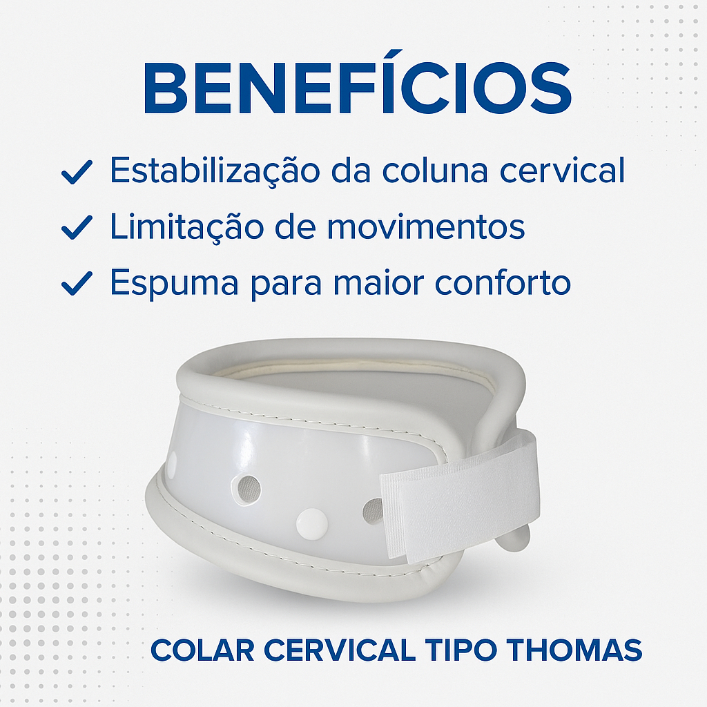 Colar Cervical Tipo Thomas Indicações: Traumatismos, torcicolos e outras lesões da coluna cervical. Características: Confeccionado com espuma de polifórmio. Tamanhos: P/M/G O Colar Cervical Tipo Thomas é a solução ideal para quem busca alívio de dores e lesões na região cervical. Projetado para fornecer suporte firme e confortável, ele é indicado para tratamentos pós-traumáticos, contusões, entorses ou para estabilizar a coluna cervical durante a recuperação de cirurgias. Seu design anatômico e ajustável proporciona um ajuste perfeito, garantindo máxima estabilidade sem abrir mão do conforto. Benefícios: - Suporte rígido e seguro para a região cervical, limitando movimentos e acelerando a recuperação. - Ajuste personalizado, adaptando-se ao contorno do pescoço e garantindo um encaixe confortável. - Tecido respirável e acolchoado, ideal para o uso prolongado. - Indicado para pós-cirúrgico, lesões ou tratamentos de problemas cervicais como torcicolo ou hernia cervical. - Fácil de usar e discreto, perfeito para o uso no dia a dia.