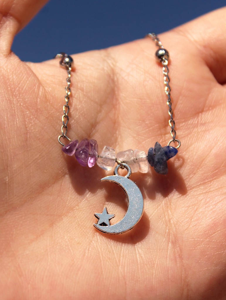 Colar com pingente em metal e pedrinhas ametista, cristal e lápis lazúli. Prazo de Envio 3 Dias Úteis. Hippie Artesanatos.