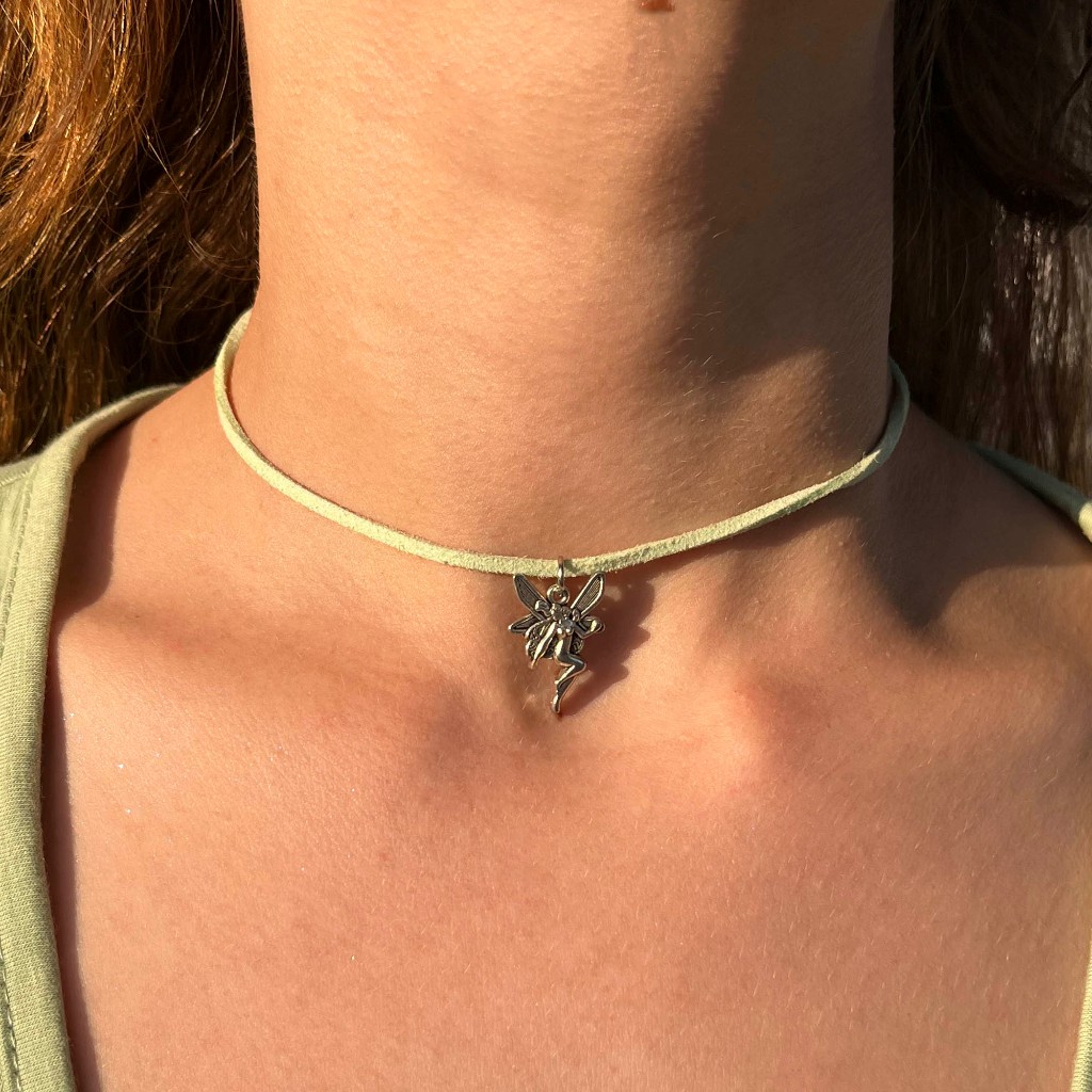 Colar/Choker Fairy com Renda Pingente de Fada Camurça Cottagecore