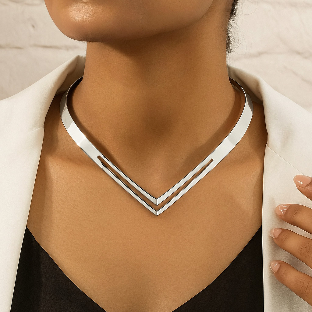 Colar Choker Feminino em Formato de V Duplo banhado a ouro 18k e prata 925 Brilhe com elegância usando o Colar Choker Feminino em Formato de V Duplo, uma peça que combina design moderno e estilo sofisticado. 🌟 O formato em “V” duplo valoriza o colo e alonga o pescoço, criando um visual marcante e refinado. Com acabamento liso e espelhado, este colar destaca-se pelo toque minimalista e elegante, ideal para festas, eventos ou uso diário. 💫 Leve e confortável, ele complementa perfeitamente desde looks casuais até produções mais glamourosas. 💖 Um acessório que une delicadeza e modernidade, perfeito para mulheres que amam brilhar com charme e sofisticação. ✨ Gender:Female Region of Origin:Brasil Style:Vintage
