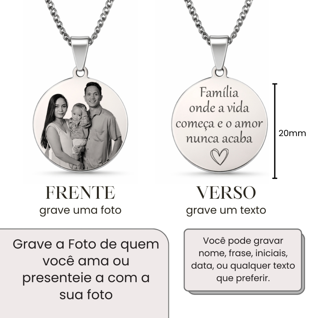 💖 Transforme uma foto especial em uma joia eterna Nosso colar personalizado com foto é produzido em Aço Inox 316L polido de alta qualidade, com fotogravação a laser de alta definição. Uma forma única e emocionante de carregar no peito quem você mais ama. Perfeito para eternizar momentos especiais com quem faz parte da sua história. ✅ Vantagens do nosso produto • Aço Inoxidável 316L de alta qualidade • Hipoalergênico (seguro para peles sensíveis) • Pode molhar sem danificar • Não enferruja • Não escurece com o tempo • Fotogravação a laser de alta precisão • Fabricação própria 🔍 Detalhes do Produto • Pingente Redondo – 2cm • Material: Aço Inox Polido 316L • Corrente modelo Grumet • Comprimento da corrente: 45cm ou 60cm • Fotogravação a laser de alta definição • Produção própria com controle de qualidade • Envio em até 24h úteis 🎁 Presente perfeito para 💖 Dia das Mães 💖 Dia dos Namorados 💖 Aniversários 💖 Datas especiais 💖 Homenagens e lembranças eternas Um presente único que emociona e guarda memórias para sempre. 📸 Como personalizar? 1️⃣ Após a compra, envie sua foto pelo chat 2️⃣ Nossa equipe prepara a arte para gravação 3️⃣ Produzimos seu colar personalizado 4️⃣ Enviamos rapidamente para você ✨ Uma joia personalizada é mais que um acessório — é uma lembrança eterna.
