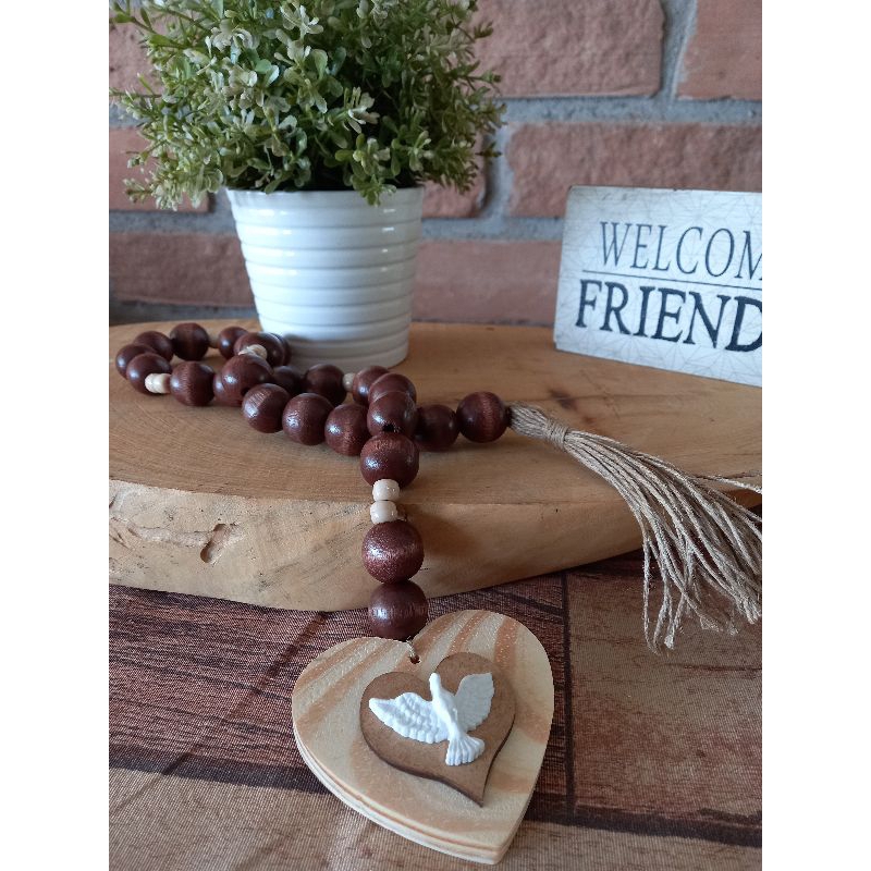 O colar de mesa é um item decorativo para deixar seus ambientes mais aconchegantes. Confeccionado com bolas de madeira de 20mm, é uma peça rústica e de qualidade. Coração em madeira pinus. Pomba da paz em gesso. Aproximadamente 80cm de comprimento. Do nosso ateliê para o seu lar.