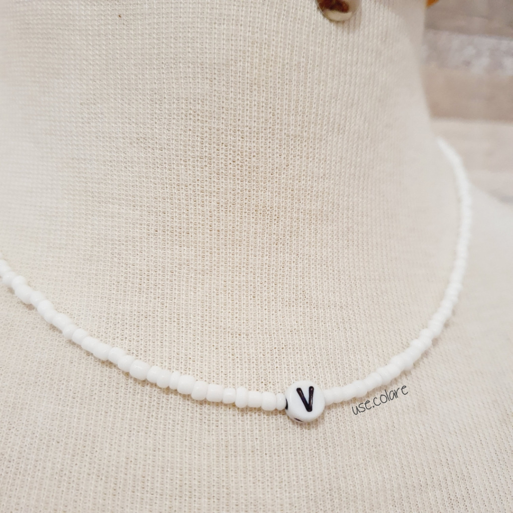 Colar de miçanga branco com letra inicial personalizada