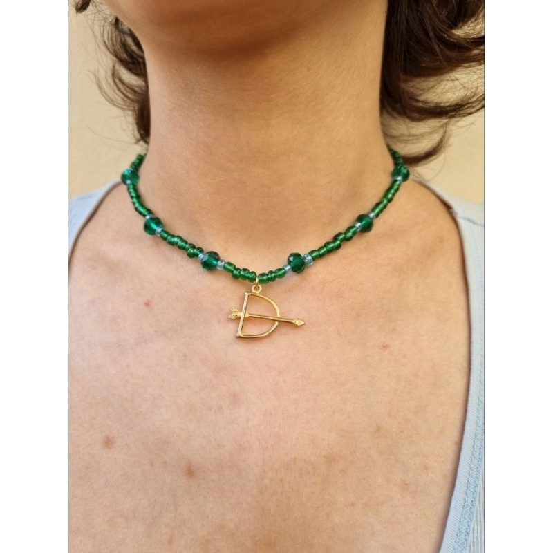 Colar de miçangas/Chocker /Gargantilha com pingente dourado de Ofá de Oxóssi feito com contas transparentes verde e Contas de Cristais