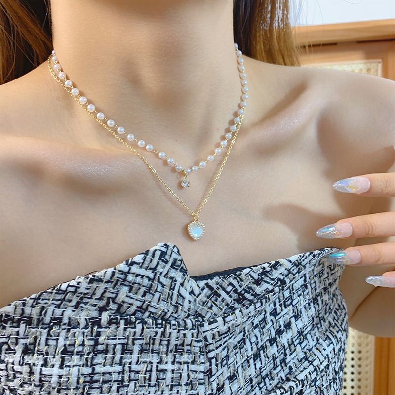 Colar De Pérola Vintage De Camada Dupla Com Pérolas Em Formato De Coração E Pedras De Diamante