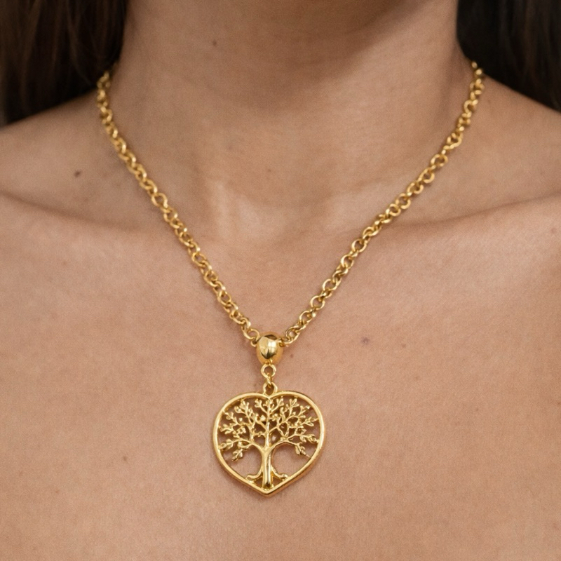 Colar e Brinco Coração Árvore da Vida folheado