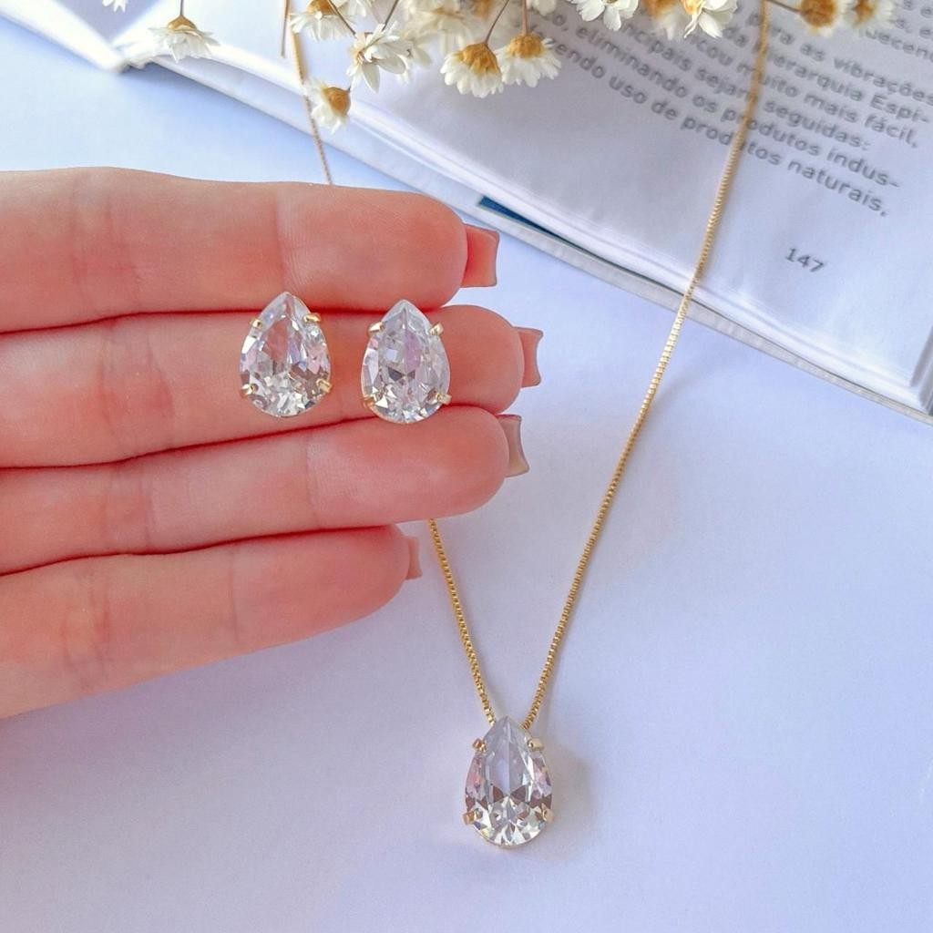 💎 Colar e Brinco Gota Cristal Zircônia – Folheados a Ouro 18 K e Prata 925 Antialérgico 💎