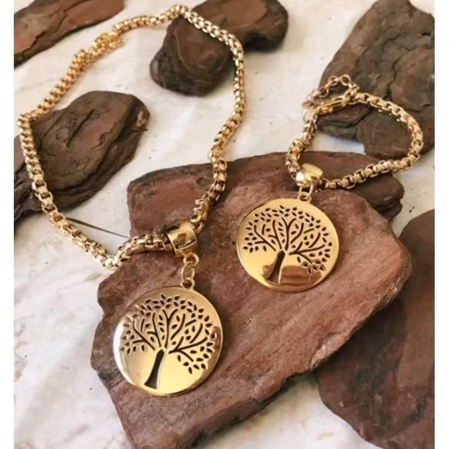 Colar e pulseira feminina de ouro e aço com pingente de árvore da vida, design elegante, simbolizando prosperidade