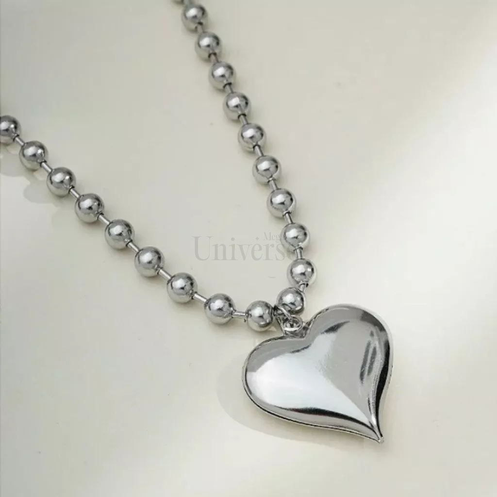 Colar em aço Inox 316L Corrente Bolinha de 6mm Com Pingente Coração de 30x30mm e Fecho Canoa Hipoalergênico Não Escurece