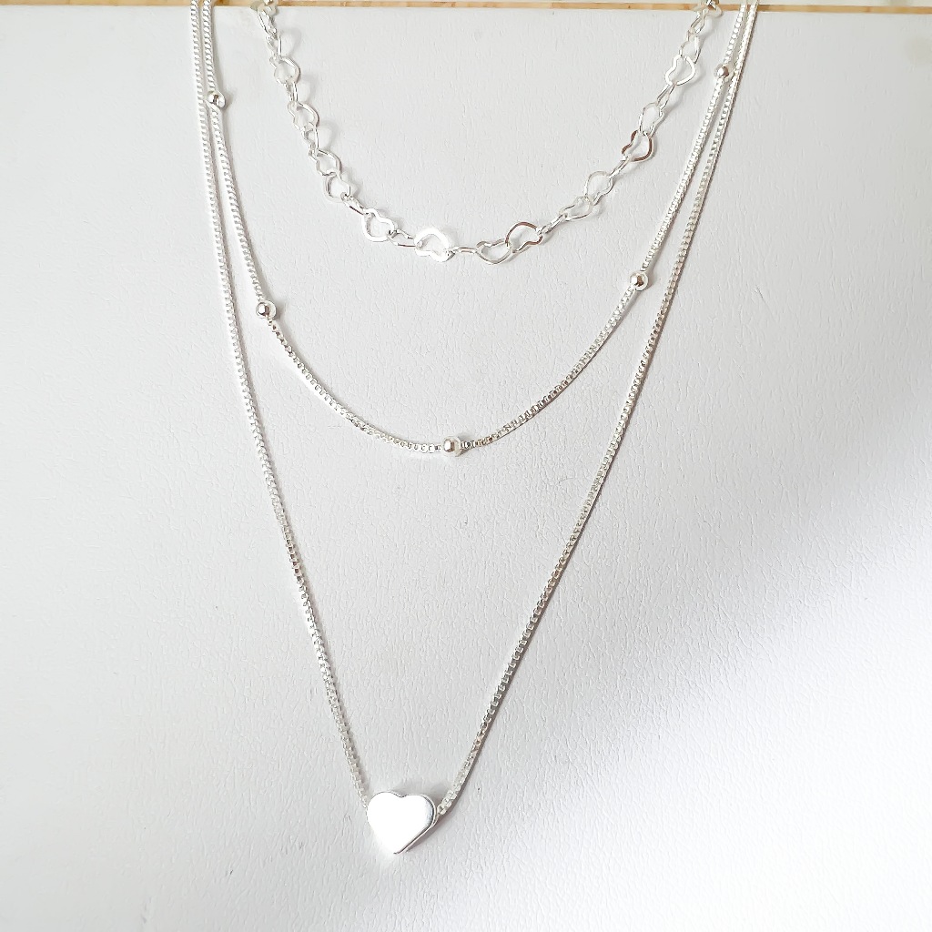 Descrição do produto Colar triplo feminino prata com pingente de coração, modelo peça única (as 3 camadas são presas no mesmo fecho). Super delicado, fácil de usar e já vem pronto no efeito de mix de colares. • Colar triplo em peça única (não separa) • 1ª camada: choker de corações – 35 cm • 2ª camada: corrente com bolinhas – 40 cm • 3ª camada: corrente com pingente de coração – 45 cm • Cor: prata • Estilo: delicado, romântico e moderno • Confortável para uso diário, festas, encontros e presentear Perfeito para quem gosta de praticidade: é só colocar e já fica com efeito de 3 colares em camadas, lindo em qualquer look!