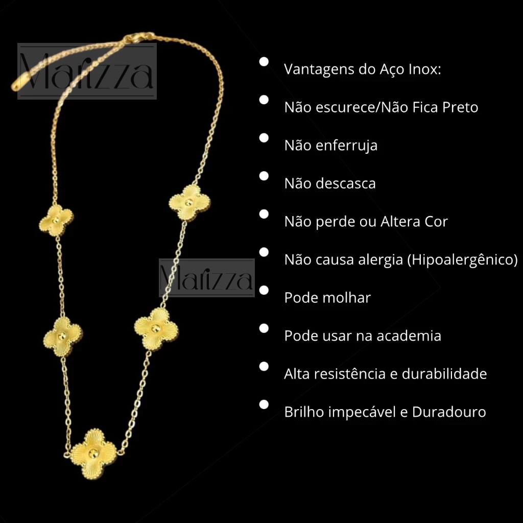 Nós da Marizza somo uma empresa com mais de 20 anos de experiência com lojas físicas, resolvemos ampliar e mostrar a qualidade dos nossos produtos para clientes do Brasil todo através dessa plataforma, somos uma empresa seria com CNPJ, portanto temos registro legal e nota fiscal, nossas pratas são legitimas e com certificado, nossos aços inoxidáveis são de altíssima qualidade, fornecedores que trabalhamos a anos, você pode confiar!! "Não visamos preço, estamos sempre em busca de qualidade" OS TREVOS SÃO EM MADREPÉROLA, NÃO SÃO DE PLASTICO, a madrepérola tem uma qualidade e brilho totalmente diferentes do plástico. Material: Aço inoxidável 316L Antialérgico legítimo com banho dourado ou prateado Peso: 3,0g Tamanho: 41cm de colar + 7cm extensor (Possui ajuste de 40cm até 48cm podendo variar um pouquinho) Itens inclusos: - Colar trevo aço inoxidável dourado ou prateado - Porta joias grande Marizza - Informativo de cuidados com a peça - Brinde de lacinhos de cabelo Quais as Vantagens da peça em aço inoxidável? - Ótimo custo beneficio - Não escurece - Não oxida - Não descasca - Pode tomar banho, piscina e mar.