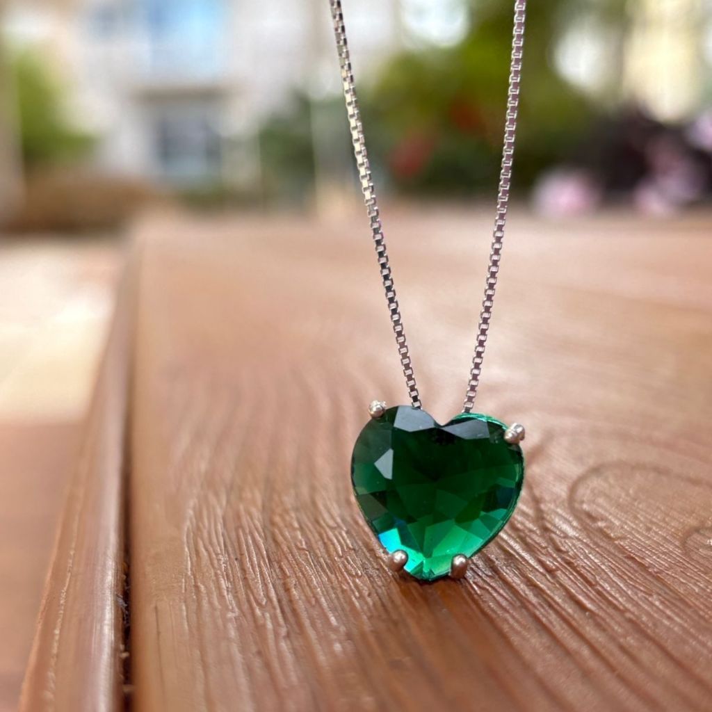 Colar Feminino de Prata 925 Coração Galeria Verde Esmeralda 45cm
