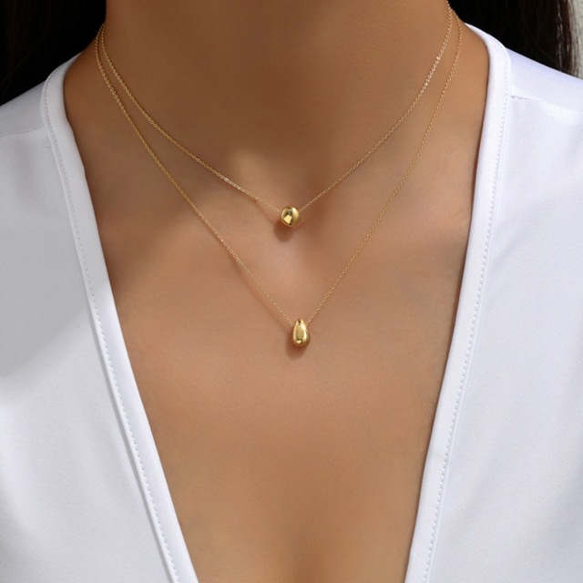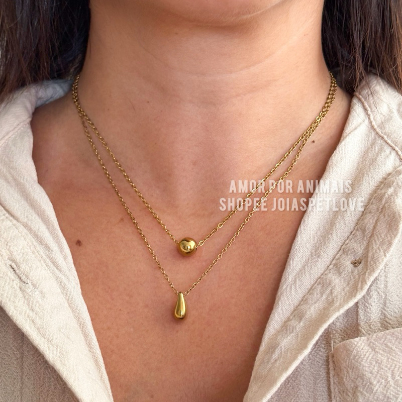 Colar Feminino Moderno 2 em 1 de Aço Inoxidável Com Pingentes Gota e Esfera Corrente de Ouro Prata