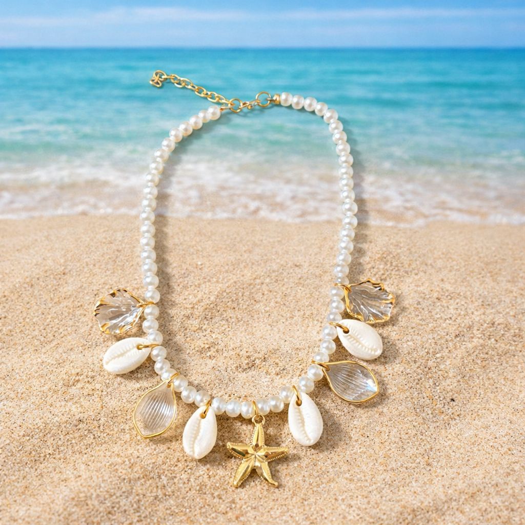 Colar Praia "Colar de praia delicado e sofisticado, com uma corrente leve em tom dourado, adornada por pequenos pingentes de pérolas naturais. O design suave e fluido é ideal para complementar looks praianos, com um toque de elegância natural. As pérolas trazem um brilho discreto e um visual que remete ao frescor do mar, perfeito para quem deseja um acessório simples, mas encantador, para usar em momentos descontraídos ou em ocasiões especiais à beira-mar."