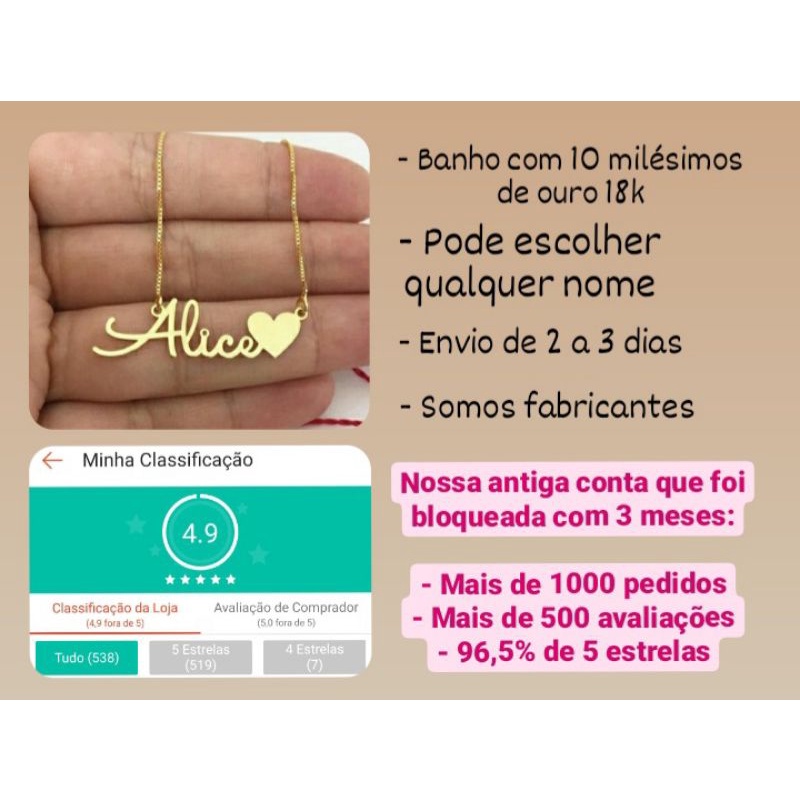 Colar Manuscrito (Colar com nome) - Banhado a ouro 18k - Fonte Tradicional (Birds of Paradise) Confecção e Envio de 2 a 5 dias no máximo *Fazemos qualquer nome - Banhado com 10 milésimos de ouro 18k - Corrente Veneziana 45cm - Tamanho: Letra maiúscula aproximadamente 9mm e minúscula 5mm - Fonte: Letra Tradicional (Birds Of Paradise) - Peso: Aproximadamente 3 gramas * Corte feito a laser, o que proporciona um acabamento perfeito. Assim que finalizar a compra, nos envie o nome pelo Chat. - Se tiver interesse na confecção do nome com algum detalhe (Coroa, Coração), comprar do anuncio que tem essa opção *** Somos Fabricantes ***