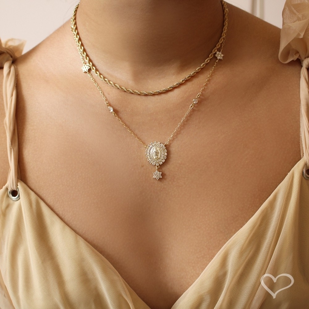 Material: Metal e Zircônias. Banho: Ouro 18k. Tamanho do colar: 40 cm. Extensor: 8 cm. Tamanho da Medalha: 3 cm x 1.8 cm. Peso: 0,006 g. Apresentamos a você o deslumbrante Colar Nossa Senhora das Graças da Piuka, uma verdadeira obra-prima de elegância e espiritualidade. Delicadamente concebido com uma medalha cravejada de deslumbrantes zircônias cristalinas, que capturam a luz com um brilho celestial. Uma pequena flor, também adornada com zircônias cristalinas, adiciona um toque de encanto celestial. Este colar é uma joia única, montado em uma corrente de elos intercalados, pontuada por pequenas e radiantes zircônias, que iluminam a sua jornada com sua cintilante beleza. Seu design inclui um extensor prático e um fecho lagosta, garantindo um ajuste perfeito e seguro. Na Piuka, somos apaixonados por acessórios que não apenas embelezam, mas também carregam significado. Este colar Nossa Senhora das Graças é mais do que uma joia; é uma expressão de fé e proteção, que eleva o seu visual enquanto acompanha cada passo da sua trajetória. Use este magnífico colar individualmente para um toque sutil de elegância, ou combine-o com outras deslumbrantes peças da nossa coleção, como colares e chokers Piuka, para criar um look verdadeiramente cativante. Não perca a oportunidade de adquirir essa joia especial. Aproveite enquanto ainda está disponível e acrescente um toque divino ao seu estilo! Observações - Garantia de 3 meses quanto ao banho - É uma peça hipoalergênica, pois não contém níquel em sua composição - Dica da Piuka: Para fazer a limpeza dos seus acessórios, use nossa flanela mágica, ela ajudará a manter suas peças sempre brilhantes.