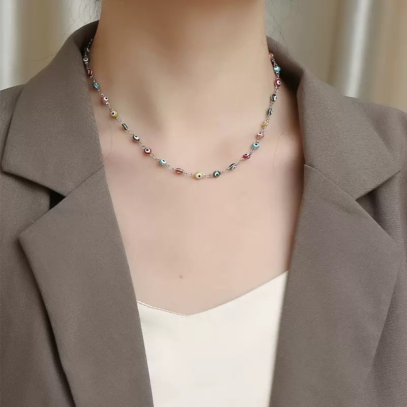 Colar com contas de vidro em formato de olho grego (olho turco/evil eye), símbolo de proteção e sorte. Design delicado e moderno, disponível em cores sortidas ou azul clássico. • Material: Vidro artesanal + corrente em aço inoxidável • Cores: Multicolorido / Azul • Comprimento: Aproximadamente 45 cm + extensor ajustável • Fecho: Tipo lagosta, prático e seguro • Significado: Amuleto tradicional contra a inveja e mau-olhado • Indicação: Ideal para uso diário, presentes ou combinações fashion 👉 Um acessório cheio de estilo e significado espiritual, perfeito para compor looks modernos e trazer boas energias.