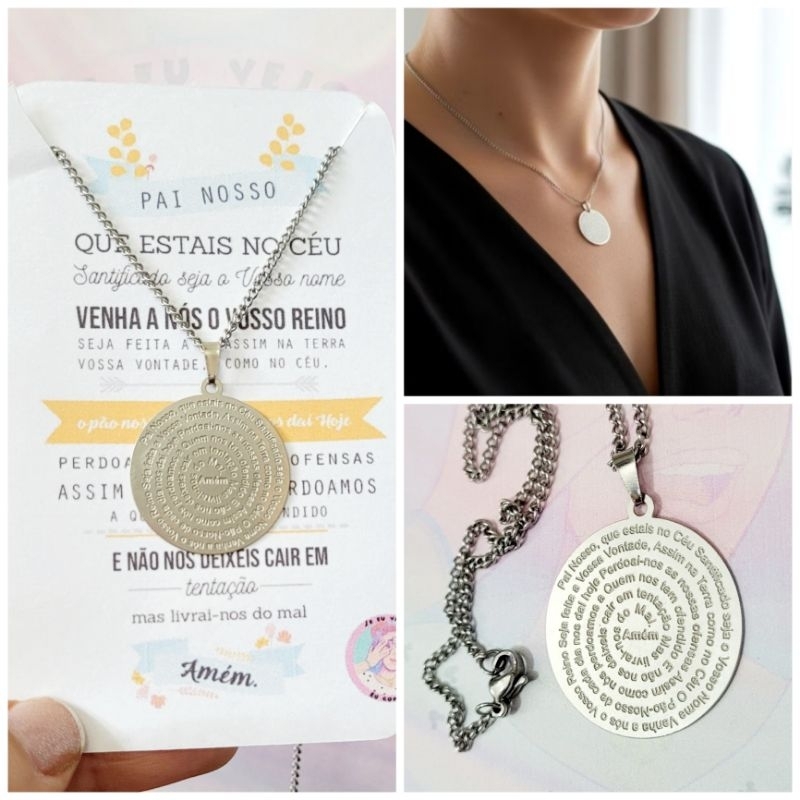 Colar oração Pai Nosso aço inox cirúrgico gargantilha corrente pingente medalha prata