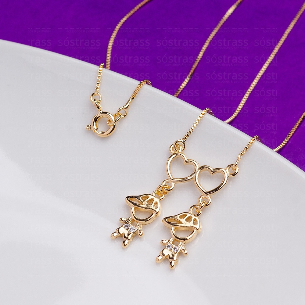 Colar Pingente Menino ou Menina Canga Coração Vazado Dourado Folheado A ouro 18k Presente Mãe