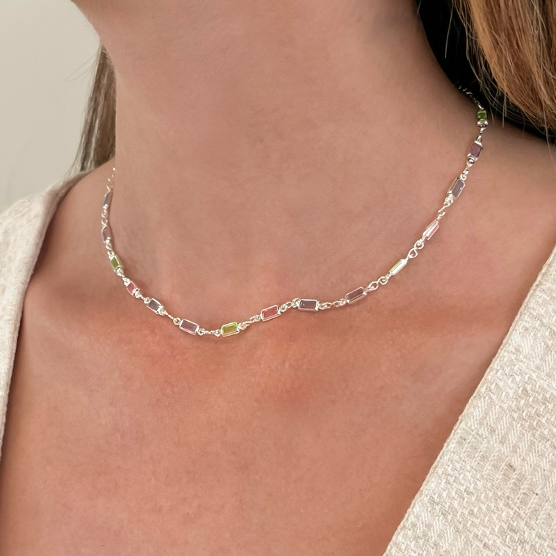 Colar prata 925 pedras coloridas com garantia corrente feminino curto choker 35cm + 10cm extensor