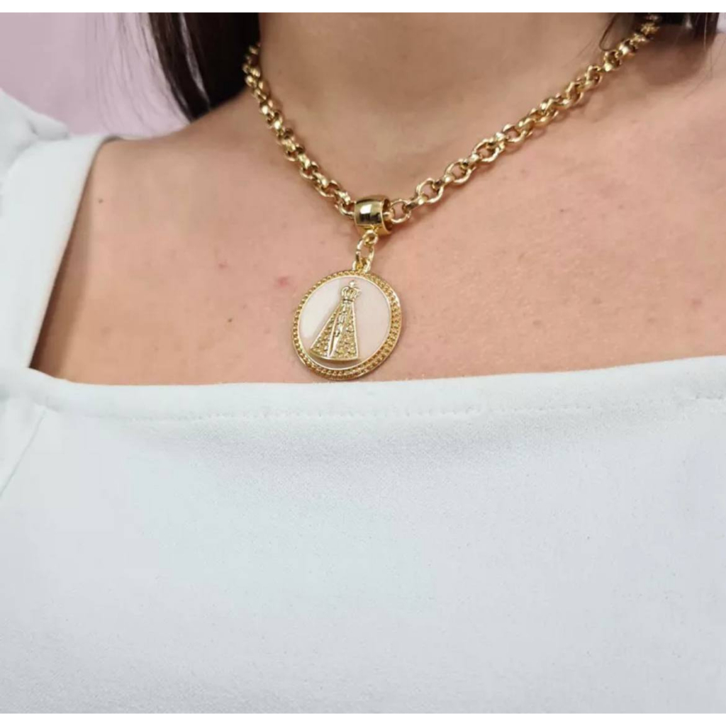 Colar + pulseira Feminino Corrente Grossa Dourado banhada, semi joia Medalha Nossa Senhora Aparecida Promoção