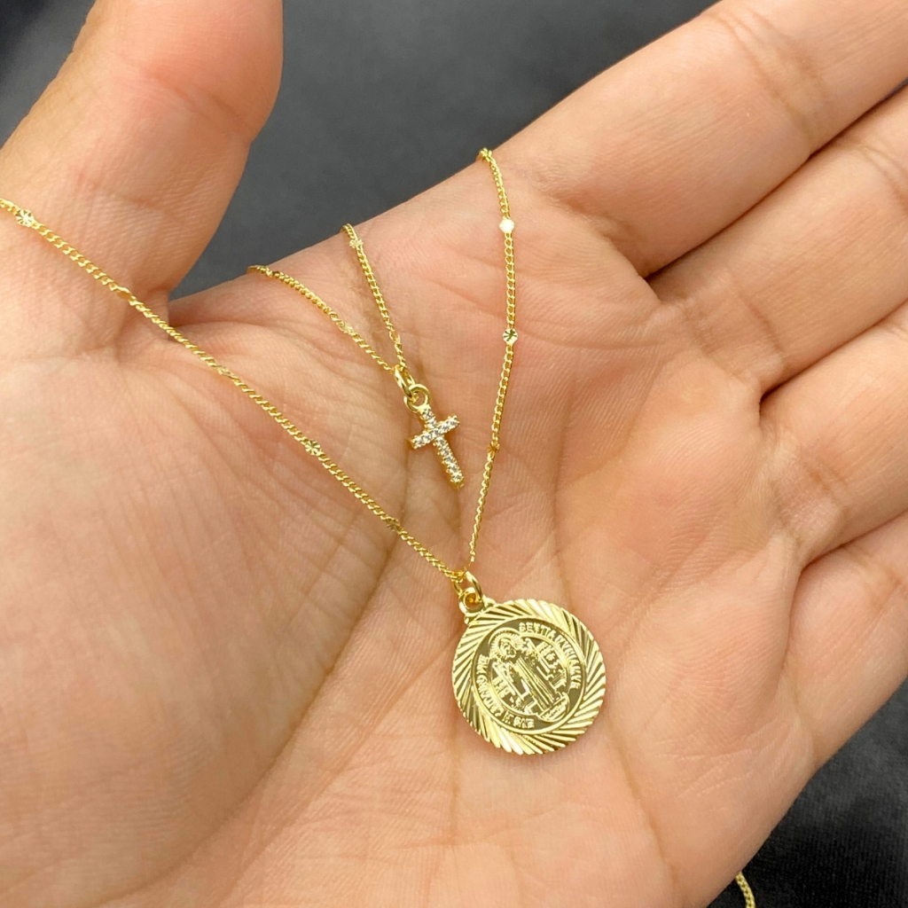 Colar São Bento + Cruz Cravejada Feminina Banhada Ouro 18K Corrente Grumet 24cm Com 2 Pingentes