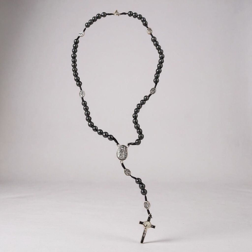 Colar Terço De Pescoço Nossa Senhora Aparecida Hematita Com Fecho