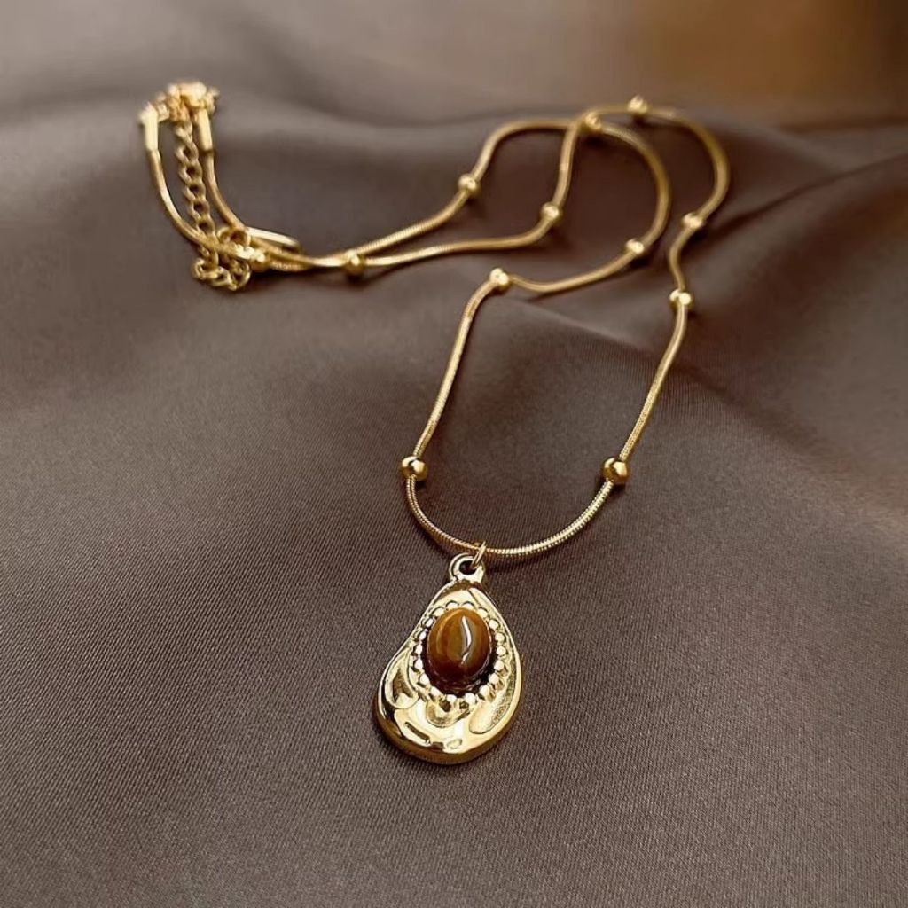 Colar vintage em aço inoxidável 18K com pedra olho de tigre irregular, design exclusivo, luxuoso e discreto, corrente de