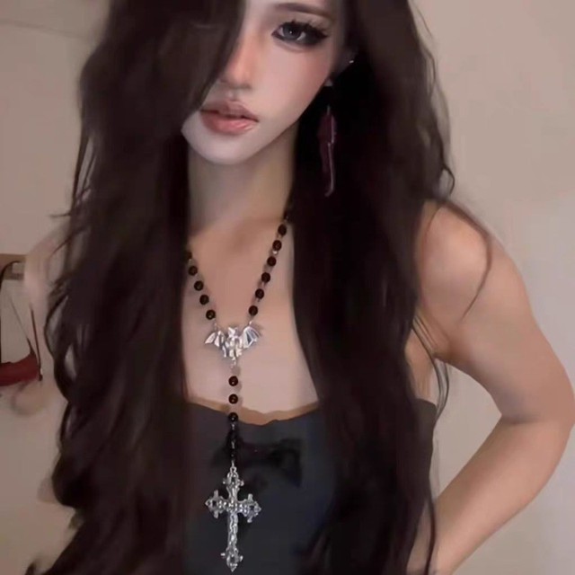 Colares Góticos Com Cruz De Morcego Para Mulheres , Colar Longo Preto Contas , Acessórios De Moda
