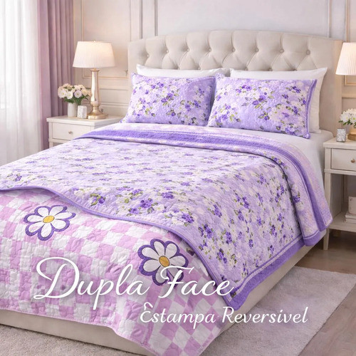 Colcha Cobre Leito Queen 3 Peças Dupla Face 220x260 Estampas Kit Cobre Leito Rosa/roxo Florido