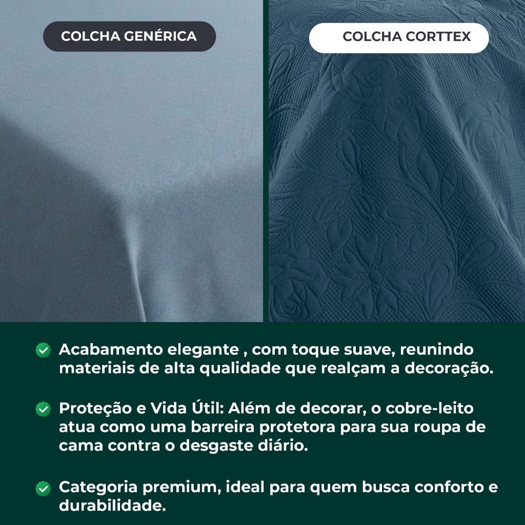Colcha Cobre Leito Milão Corttex – 2 Peças 🛏️ A Colcha Cobre Leito Milão Corttex é a união ideal entre beleza, conforto e praticidade, perfeita para quem deseja deixar o quarto mais elegante e aconchegante. Com design sofisticado e contemporâneo, seus detalhes e acabamento valorizam a decoração, trazendo um toque de requinte ao ambiente. Produzida com materiais de alta qualidade, oferece toque macio e confortável, ideal para o uso diário. Além de embelezar a cama, a colcha auxilia na proteção da roupa de cama, contribuindo para maior durabilidade. Fácil de cuidar, mantém sua aparência bonita por muito mais tempo quando seguidas as instruções de lavagem. ✔ Produto 100% original Corttex ✔ Design elegante e atemporal ✔ Conforto e praticidade para o dia a dia Conteúdo da Embalagem: 1 Colcha Cobre Leito – 2,40 m x 1,60 m 1 Porta-travesseiro – 70 cm x 50 cm ❓ Perguntas Frequentes (FAQ) • O produto é original? Sim. Produto original Corttex. • Serve em qual tipo de cama? Indicado para cama de solteiro. Recomendamos conferir as medidas antes da compra. • Acompanha travesseiro ou enchimento? Não. Acompanha apenas o porta-travesseiro (capa). • Pode ser lavado na máquina? Sim. Recomendamos seguir as instruções da etiqueta para melhor conservação. • As cores são iguais às fotos? As imagens são ilustrativas e podem apresentar leve variação de tonalidade conforme a tela. 🏷️ Tags #colchamilão #colchacorttex #colchasolteiro #enxoval #decoraçãoquarto #camaarrumada #produtooriginal