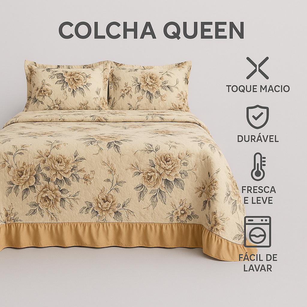 💖👑 Kit Colcha Queen 3 Peças Floral Estampado com Babado 🛏️✨ Transforme seu quarto com o luxo e a elegância do Kit Colcha Queen 3 Peças! Perfeito para Cama Box Queen, este cobre-leito floral traz um toque de sofisticação e conforto para sua decoração. 🌸 Detalhes que Encantam: Conteúdo: Colcha Queen (2,60m x 2,40m) + 2 Porta Travesseiros estampados. Design: Estampa Floral Clássica com cores vivas e vibrantes (disponível em tons de bege/marrom, vermelho/tabaco, floral azul e floral roxo). Acabamento: Lindo babado na barra que destaca a peça e adiciona um charme romântico. ✅ Qualidade e Conforto Garantidos: Tecido: 💯% Poliéster de alta qualidade. Conforto: Toque macio, fresco e leve, ideal para todas as estações. Durabilidade: Produto durável e resistente. Praticidade: Super Fácil de Lavar (pode ir na máquina). 📐 Medidas Perfeitas: Tamanho: Queen Size (2,60m comprimento x 2,40m largura). Ideal para colchões com até 30cm de altura, garantindo uma caída perfeita na sua cama queen box. Não perca a chance de ter um kit cama completo, combinando beleza e praticidade! É a escolha ideal para quem busca roupa de cama queen com estampa floral elegante. 👉 Adicione ao carrinho e renove seu ambiente com este enxoval completo e aconchegante! Decoração de quarto nunca foi tão fácil!