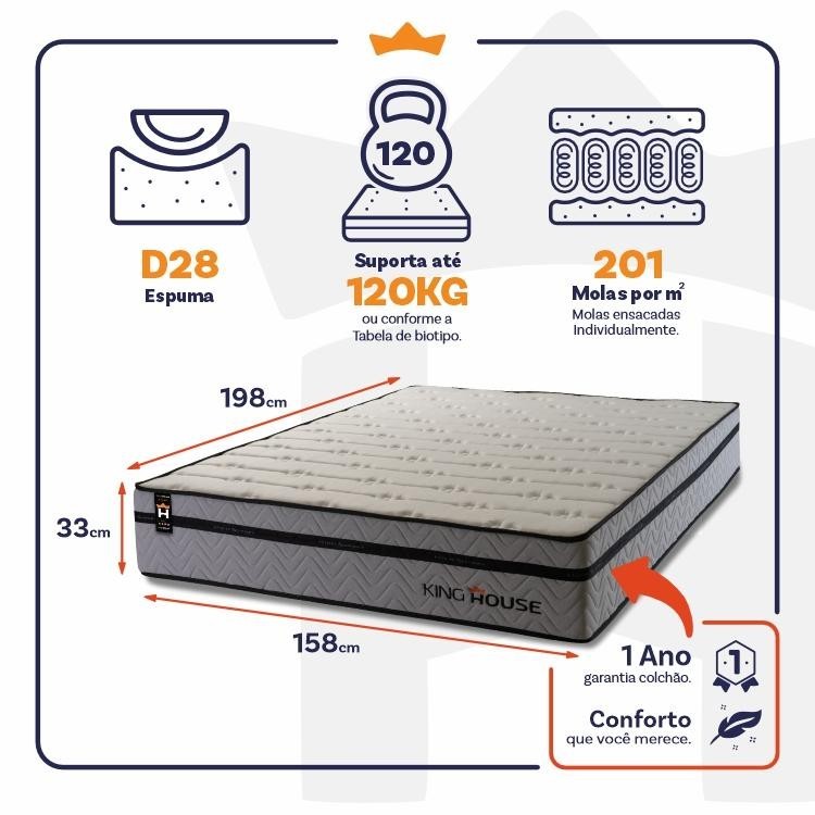 Dica Importante Gostou do produto, mas o tamanho não se encaixa à sua necessidade? Não tem problema, o Colchão Preston está disponível em 5 medidas para que se adapte a qualquer ambiente. Nada melhor do que dormir confortavelmente, seja sozinho ou com seu parceiro, com um amplo espaço e conforto, não é mesmo?! Medidas do Colchão: 88x188x28 cm, 96X203x28 cm,138x188x28 cm, 158x198x28 cm, 193x203x28 cm. Cores do Colchão: Cinza; Caso você tenha interesse em visualizar os anúncios de alguma das opções acima, basta efetuar uma busca de acordo com as opções descritas. Introdução ao Produto: Sabe aquela sensação de felicidade e satisfação que você sente quando faz uma boa escolha?! Pois bem, essa é a sensação de comprar um Preston. Um produto moderno com design elegante, que irá transformar para sempre suas noites de sono :) Feito com os mais nobres materiais em sua composição, ele conta com espuma D28 e molas ensacadas. Por ser mais macio, o colchão de molas ensacadas individualmente traz benefícios e ajuda no alinhamento da coluna. O colchão King Size House acomoda melhor o contorno do corpo, dispondo de forma correta quadris e ombros, expulsando as dores e problemas de coluna. Não perca mais tempo e garanta já o seu colchão Preston! Características: - Espuma D28; - 201 molas por m2 ensacadas individualmente; - Suporta até 120 kg por pessoa. Dimensões: - Altura: 33 cm; - Largura : 158 cm; - Comprimento: 198 cm. Conteúdo da embalagem: - 01 Colchão Queen Size Preston Cinza; - 01 Certificado de garantia. - 01 Manual de montagem. Garantia: 1 ano de garantia nas molas, 1 ano de garantia nas espumas e 3 meses no revestimento. Informações Relevantes: - É imprescindível ter ciência de que é possível que haja divergência de tonalidade nos tecidos devido às variações de configurações de monitores/telas e lotes do fornecedor; - Não nos responsabilizamos pelo transporte por escadas, elevadores, guincho ou içamento deste produto, qualquer despesa é de responsabilidade do cliente; - Verifique as dimensões do produto, certificando-se de que o mesmo possa ser transportado por portas, corredores e elevadores; - Os objetos que decoram a imagem, não acompanham o produto; - Não nos responsabilizamos pela instalação e montagem; - Prestamos assistência somente por defeitos de fabricação. Nosso produto é certificado pelo INMETRO! CERTIFICADO DE CONFORMIDADE NÚMERO: 07424-001-02/2019 OCP: 003