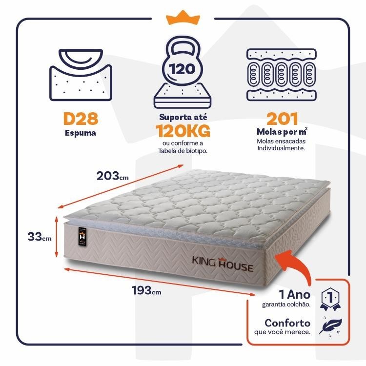 Dica Importante Gostou do produto, mas o tamanho não se encaixa à sua necessidade? Não tem problema, o Colchão Roma está disponível em 4 medidas para que se adapte a qualquer ambiente. Nada melhor do que dormir confortavelmente, seja sozinho ou com seu parceiro, com um amplo espaço e conforto, não é mesmo?! Medidas do Colchão: 96X203x33 cm, 138x188x33 cm, 158x198x33 cm, 193x203x33 cm. Cores do Colchão: Bege; Caso você tenha interesse em visualizar os anúncios de alguma das opções acima, basta efetuar uma busca de acordo com as opções descritas. Introdução ao Produto: Sabe aquela sensação de felicidade e satisfação que você sente quando faz uma boa escolha?! Pois bem, essa é a sensação de comprar um Roma. Um produto moderno com design elegante, que irá transformar para sempre suas noites de sono :) Feito com os mais nobres materiais em sua composição, ele conta com espuma D28. O colchão King House acomoda melhor o contorno do corpo, dispondo de forma correta quadris e ombros, expulsando as dores e problemas de coluna. Não perca mais tempo e garanta já o seu colchão Roma! Características: - Espuma D28; - One face; - Peso Suportado: *Consultar tabela de biotipo nas imagens do produto. Dimensões: - Altura: 33 cm; - Largura : 193 cm; - Comprimento: 203 cm. Conteúdo da embalagem: - 01 Colchão King Size Roma Bege; - 01 Certificado de garantia. - 01 Manual de montagem. Garantia: 1 ano de garantia nas espumas e 3 meses no revestimento. Informações Relevantes: - É imprescindível ter ciência de que é possível que haja divergência de tonalidade nos tecidos devido às variações de configurações de monitores/telas e lotes do fornecedor; - Não nos responsabilizamos pelo transporte por escadas, elevadores, guincho ou içamento deste produto, qualquer despesa é de responsabilidade do cliente; - Verifique as dimensões do produto, certificando-se de que o mesmo possa ser transportado por portas, corredores e elevadores; - Os objetos que decoram a imagem, não acompanham o produto; - Não nos responsabilizamos pela instalação e montagem; - Prestamos assistência somente por defeitos de fabricação. Nosso produto é certificado pelo INMETRO! CERTIFICADO DE CONFORMIDADE NÚMERO: 07424-001-02/2019 OCP: 003