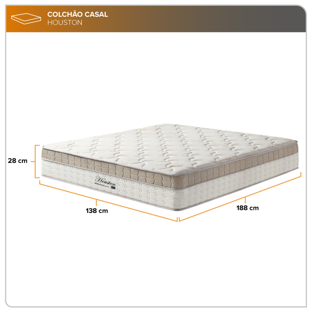 Colchão Casal Molas Ensacadas Houston DETALHES DO COLCHÃO: * TIPO DE PILLOW Euro Pillow - Essa camada é um pouco maior do que os outros Pillows, e consequentemente mais bonitas também. A camada Europillow foi criada para seguir os modelos de confecções europeus. * TIPO DE BORDADO TECIDO DO TAMPO Bordado Continuo - O Bordado Continuo e feito por padrões de Desenho em Sequencia, que aumentam a beleza e a sensação de maciez e conforto de seu Colchão * TIPO DO TECIDO DO TAMPO E LATERAL Tampo em Malha - podemos dizer que a malha é uma estrutura criada a partir de uma tecelagem específica, com o ato de entrelaçar os fios em um sentido constante. Isso confere ao mesmo tempo flexibilidade e força à peça, tornando-a muito resistente e maleável. Lateral em Suede - Que possui um toque extremamente macio e alta resistência ao atrito, garantindo uma textura sempre bonita e elegante * TRATAMENTO DOS TECIDOS Possui um tratamento especial contra ácaros e outras bactérias, prevenindo e evitando crises alérgicas causadas por ácaros presentes na poeira doméstica. * NO TURN ou ONE SIDE Modo de utilização com tecnologia No Turn ou One Side. O sistema No Turn ou One Side elimina a preocupação de virar seu colchão com frequência. DETALHES INTERNOS DO COLCHÃO: * TIPO DE ESTRUTURA DE MOLAS Molas Ensacadas - são produzidas em formato barril pré comprimidas e confeccionadas em com fio de aço com alto teor de carbono e espessura 2.0 * CAMADAS DE ESPUMA INTERNA Espuma Compactada (D70) - A Espuma Compactada se caracteriza por ser um bloco compactado feito a partir da prensa de espumas de poliuretano * TIPO DE BASE / ESTRUTURA Tipo de Base Ortopédico em PRA Chapa Laminada (Especial) de Poliestireno. Com função de proporcionar suporte base de apoio para sustentar. * OUTRAS CARACTERÍSTICAS INTERNAS Sistema Polyframe Reforço das Bordas em Espuma, Sistema usado nos colchões de molas, composto por um quadro que envolve com borda de espuma de alto suporte (D26) toda lateral do colchão. + SUPORTE DE PESO Suporte de Peso ideal de até 120 kg Por Pessoa + TIPO DE CONFORTO Possui o nível intermediário/Firme + CERTIFICAÇÃO DE QUALIDADE Produto 100 aprovado pelo Inmetro com certificação de Alta Qualidade dentro dos padrões para exportação. + ECOLOGICAMENTE CORRETO Produto ecológico é todo artigo que seja não poluente, não tóxico, notadamente benéfico ao meio ambiente e a saúde, contribuindo para o desenvolvimento de um modelo econômico e social sustentável. + TEMPO DE GARANTIA Até 1 (um) ano de garantia, oferecida pelo fabricante. * PRODUTO Produto de Excelente qualidade, excelente acabamento, produto com muita presença, com conforto Intermediário e molas ensacadas individualmente, possui também malha de boa qualidade em seu tampo, e resumo um produto de Ótima qualidade por todo o seu composto e também por seu excelente CUSTO BENEFÍCIO. * NOSSA QUALIFICAÇÃO Em Nossa Qualificação com nota de 1 a 10, QUALIFICAMOS este PRODUTO com NOTA 8 Dimensões: Altura: 28 cm Largura: 138 cm Profundidade: 188 cm Peso: 21,65 kg