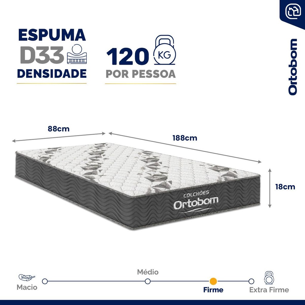Buscando um colchão com conforto firme e suporte robusto? Nosso colchão de espuma D33 é ideal para quem precisa de um suporte consistente para o corpo. Com capacidade para suportar até 120 kg por pessoa, ele oferece a firmeza necessária para uma noite de sono reparadora, mantendo a coluna alinhada e reduzindo pontos de pressão. Além disso, o revestimento em malha do colchão proporciona um conforto térmico superior, permitindo uma circulação de ar mais eficiente que ajuda a manter uma temperatura agradável ao longo da noite. Ideal para quem procura uma solução de sono que combina suporte, conforto e durabilidade em um só produto. Ortoluc: Uma linha exclusiva da Ortobom e Lucas Home, proporcionando uma experiência de sono única. Especificações Técnicas do Colchão: - Proteções: Antiácaro, Antialérgico, Antifungo, Antimofo; - Revestimento: Em malha (Conforto térmico); - Tipo: Espuma D33; - Sistema One Face: Tecnologia No Turn (permite girar o colchão); - EPS Poliestireno Expansível (Suporte adicional): Possui; - Tipo de conforto: Firme; - Peso máximo recomendado: até 120Kg (por pessoa); - Garantia: 12 meses; - Dimensões do produto (larg. x comp. x alt.) 88x188x18cm. Importante: As cores podem variar conforme a tela; Não oferecemos montagem; recomendamos profissionais qualificados. Confira as dimensões para transporte em elevadores e passagens. Não transportamos por meios especiais. Devoluções de produtos íntimos só com embalagem intacta. Por se tratar de um produto de uso íntimo e pessoal, só aceitaremos devoluções por arrependimento apenas se a embalagem do produto não for violada.