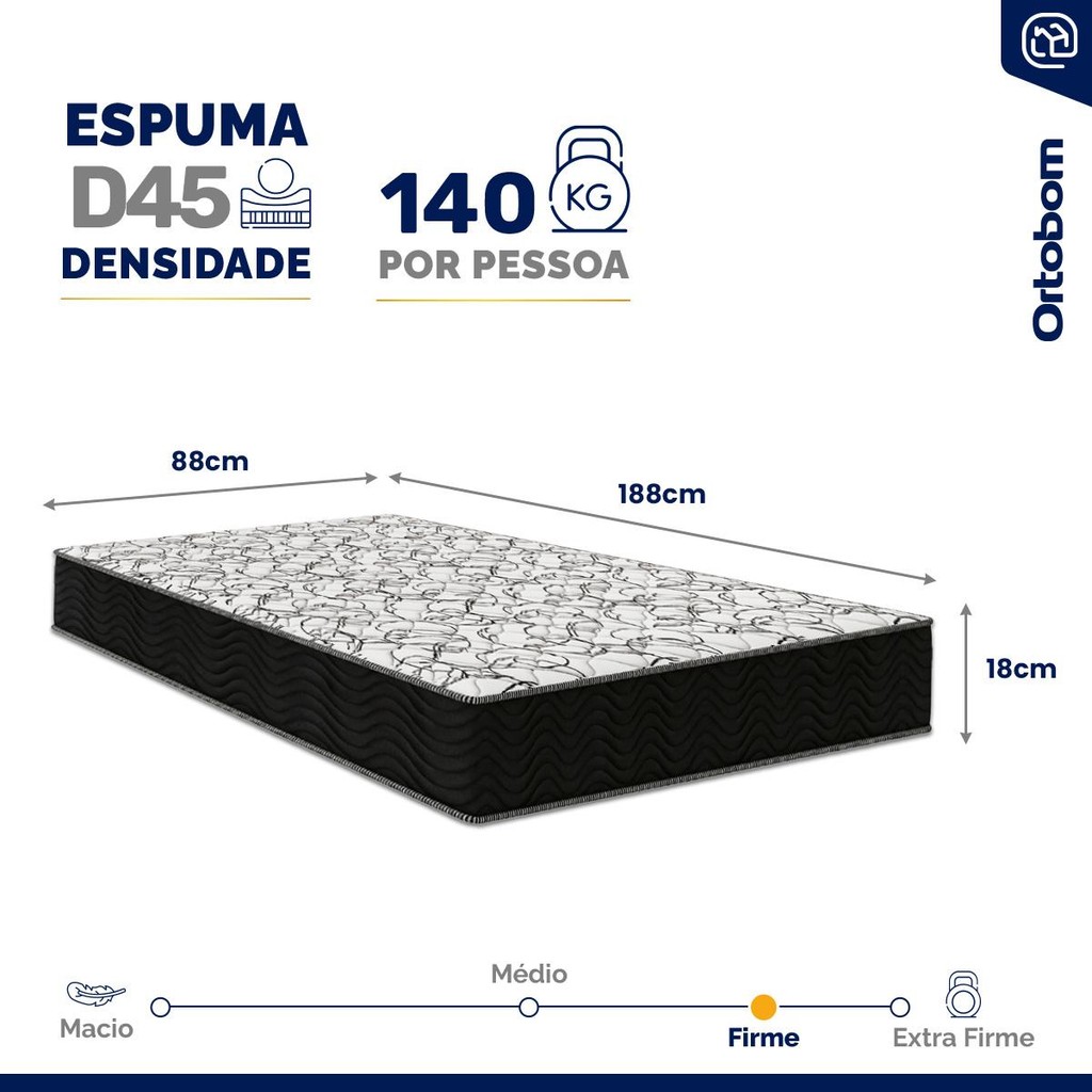Procura um colchão que ofereça suporte firme e duradouro? Nosso colchão de espuma D45 é ideal, suportando até 140 kg por pessoa. A espuma de alta densidade proporciona conforto firme, mantendo a coluna alinhada durante o sono. O revestimento em malha do colchão assegura conforto térmico, mantendo uma temperatura agradável ao longo da noite. Este colchão combina funcionalidade com conforto, tornando cada noite de descanso uma experiência rejuvenescedora. Ortoluc: Uma linha exclusiva da Ortobom e Lucas Home, proporcionando uma experiência de sono única. Especificações Técnicas do Colchão: - Proteções: Antiácaro, Antialérgico, Antifungo, Antimofo; - Revestimento: Em malha (Conforto térmico); - Tipo: Espuma D45; - Sistema One Face: Tecnologia No Turn (permite girar o colchão); - EPS Poliestireno Expansível (Suporte adicional): Possui; - Tipo de conforto: Firme; - Peso máximo recomendado: até 140Kg (por pessoa); - Garantia: 12 meses; - Dimensões do produto (larg. x comp. x alt.) 88x188x18cm. Importante: As cores podem variar conforme a tela; Não oferecemos montagem; recomendamos profissionais qualificados. Confira as dimensões para transporte em elevadores e passagens. Não transportamos por meios especiais. Devoluções de produtos íntimos só com embalagem intacta. Por se tratar de um produto de uso íntimo e pessoal, só aceitaremos devoluções por arrependimento apenas se a embalagem do produto não for violada.