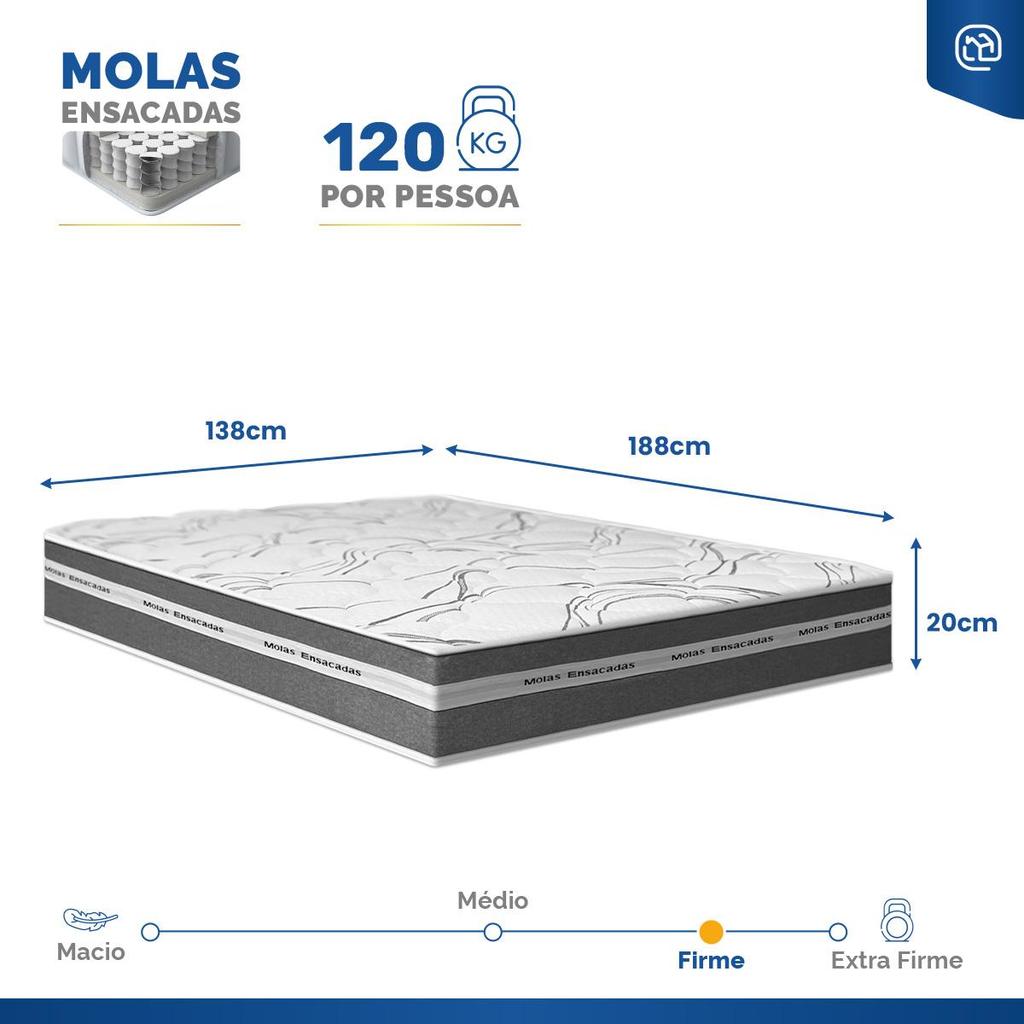 Procura firmeza e conforto ao mesmo tempo? O Colchão de Molas Ensacadas oferece suporte individualizado e firme, ideal para quem precisa de estabilidade na hora do sono. Suporta até 120kg por pessoa, garantindo resistência e noites tranquilas com o descanso que seu corpo merece. Especificações Técnicas do Colchão: - Tipo: Molas Ensacadas; - Tipo de conforto: Firme; - Proteções: Antiácaro, Antialérgico, Antifungo, Antimofo; - Tampo: Bordado; - Sistema One Face: Tecnologia No Turn (Dispensa a necessidade de girar); - Peso máximo recomendado: até 120kg (por pessoa); - Garantia: 12 meses; - Dimensões (larg. x comp. x alt.) 138x188x20cm. Importante: As cores podem variar conforme a tela; Não oferecemos montagem; recomendamos profissionais qualificados. Confira as dimensões para transporte em elevadores e passagens. Não transportamos por meios especiais. Por se tratar de um produto de uso íntimo e pessoal, só aceitaremos devoluções por arrependimento apenas se a embalagem do produto não for violada.