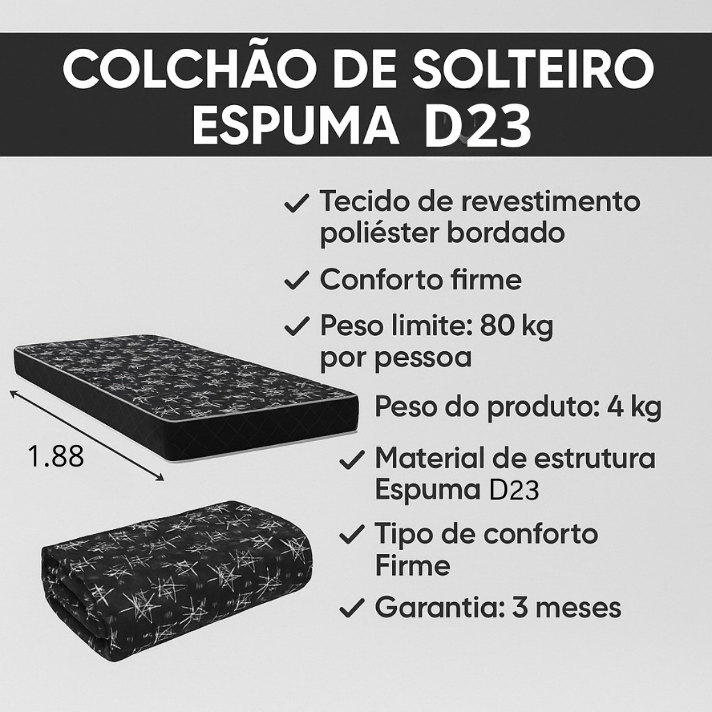 Colchão Espuma D23 Solteiro Conforto Garantia de Qualidade Melhor Custo-Benefício 188x78x12 cm