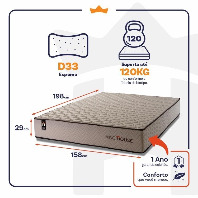 Dica Importante Gostou do produto, mas o tamanho não se encaixa à sua necessidade? Não tem problema, o Colchão San Diego está disponível em 5 medidas para que se adapte a qualquer ambiente. Nada melhor do que dormir confortavelmente, seja sozinho ou com seu parceiro, com um amplo espaço e conforto, não é mesmo?! Medidas do Colchão: 88x188x28 cm, 96X203x28 cm, 138x188x28 cm, 158x198x28 cm, 193x203x28 cm. Cores do Colchão: Bege; Caso você tenha interesse em visualizar os anúncios de alguma das opções acima, basta efetuar uma busca de acordo com as opções descritas. Introdução ao Produto: Sabe aquela sensação de felicidade e satisfação que você sente quando faz uma boa escolha?! Pois bem, essa é a sensação de comprar um San Diego. Um produto moderno com design elegante, que irá transformar para sempre suas noites de sono :) Feito com os mais nobres materiais em sua composição, ele conta com espuma D33 . O colchão King House acomoda melhor o contorno do corpo, dispondo de forma correta quadris e ombros, expulsando as dores e problemas de coluna. Não perca mais tempo e garanta já o seu colchão San Diego! Características: - Espuma D33; - Suporta até 120 kg por pessoa. Dimensões: - Altura: 29 cm; - Largura : 158 cm; - Comprimento: 198 cm. Conteúdo da embalagem: - 01 Colchão Queen Size San Diego Bege; - 01 Certificado de garantia. - 01 Manual de montagem. Garantia: 1 ano de garantia nas espumas e 3 meses no revestimento. Informações Relevantes: - É imprescindível ter ciência de que é possível que haja divergência de tonalidade nos tecidos devido às variações de configurações de monitores/telas e lotes do fornecedor; - Não nos responsabilizamos pelo transporte por escadas, elevadores, guincho ou içamento deste produto, qualquer despesa é de responsabilidade do cliente; - Verifique as dimensões do produto, certificando-se de que o mesmo possa ser transportado por portas, corredores e elevadores; - Os objetos que decoram a imagem, não acompanham o produto; - Não nos responsabilizamos pela instalação e montagem; - Prestamos assistência somente por defeitos de fabricação. Nosso produto é certificado pelo INMETRO! CERTIFICADO DE CONFORMIDADE NÚMERO: 07424-001-02/2019 OCP: 003