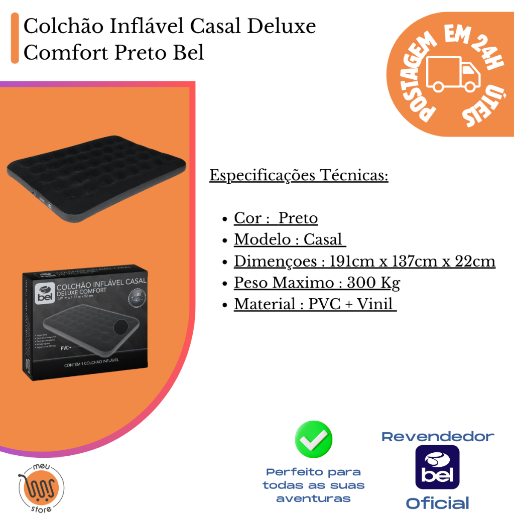 Colchão Inflável Casal Deluxe Comfort Preto Bel PRODUTO ORIGINAL a PRONTA ENTREGA Transforme seus momentos de descanso em experiências luxuosas com o Colchão Inflável Casal Deluxe Comfort Preto Bel. Perfeito para uso doméstico, camping ou viagens, este colchão oferece conforto e praticidade onde quer que você esteja. . Conforto: Seu design prático e confortável assegura uma ótima noite de sono . Versatilidade: Ideal para curtir seus momentos de lazer em casa, no camping ou em viagens . Fácil de Usar: Compacto para guardar e rápido de inflar, garantindo praticidade no seu dia a dia . Toque Aveludado: Possui um agradável toque aveludado que proporciona uma sensação de conforto incomparável . Durabilidade: Confeccionado com materiais resistentes, suporta até 300kg, garantindo segurança e estabilidade Desfrute de noites de sono tranquilas e revigorantes com o Colchão Inflável Casal Deluxe Comfort Preto da Bel. Perfeito para todas as suas aventuras e momentos de descanso! Bel Fix Desde 1950, o Grupo Bel iniciou suas atividades fabricando guarda-chuvas e sombrinhas na cidade de Curitiba. Nos anos 70, expandimos nossa produção para incluir guarda-sóis e, em pouco tempo, nos tornamos líderes na fabricação nacional. Nosso objetivo é estar presente nos seus melhores momentos, proporcionando bem-estar, conforto e diversão.
