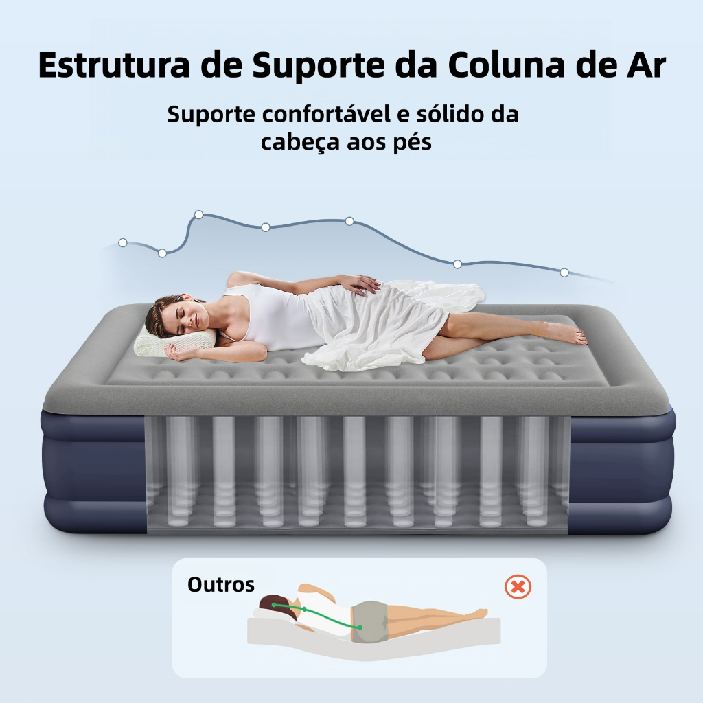 Sistema de apoio avançado] Os nossos colchões insufláveis queen size estão equipados com 40 molas a gás bem construídas que fornecem apoio da cabeça aos pés para uma noite de sono relaxante e confortável. Este sistema de apoio avançado evita a flacidez e os solavancos que são comuns noutros modelos de colchões insufláveis. [Colchao inflavel casal] Este colchão de ar tem dimensões insufláveis de 152x 205x 40 cm e uma capacidade de peso máxima de 650 lbs/300 kg, suficiente para duas pessoas. A embalagem inclui um adesivo para reparar as perfurações. [Ótimo para acampar] Concebido para utilização em casa e para acampar ao ar livre, este colchão insuflável é perfeito para dormidas, reuniões de família e amigos e viagens de campismo. Com uma bomba insuflável integrada, já não está limitado por ligações eléctricas. **Coisas a considerar *O estiramento é uma característica natural do vinil novo. Durante o uso inicial, a cama inflável pode amolecer e exigir inflação adicional para manter a firmeza necessária. Isso é normal durante os primeiros dias de uso. *Devido às diferenças climáticas, a saturação do inflável é diferente; se houver uma diferença de +/- 3-5 cm no tamanho, esse é um fenômeno normal. -Especificações. Material: flocagem de PVC Tamanho: 205*152*40cm Lista de embalagem - Colchão inflável x1 - Bomba de ar elétrica x1 - Cabo de carregamento tipo C x1 - Máscara inflável adicional x1 - Bolsa de armazenamento x1 - Kit de reparo x1 - Manual do usuário x1 Instruções de uso da cama inflável 1. Inflar: quando a bomba de ar inflar a cama inflável até a dureza adequada. Não infle demais, pois a cama se quebrará. 2. inspeção periódica: Verifique periodicamente o nível de inflação da cama inflável para garantir uma noite de sono confortável. 3. Evite objetos pontiagudos: Ao usar a cama inflável, mantenha-se afastado de objetos pontiagudos para evitar perfurações ou arranhões. 4. Efeitos da temperatura: as camas infláveis são afetadas pelas mudanças de temperatura. O ar frio fará com que o gás se contraia, enquanto o ar quente fará com que o gás se expanda. Ajuste a maciez da cama inflável de acordo com suas necessidades. 5. Elasticidade: devido à elasticidade do material, uma cama inflável nova pode ficar um pouco frouxa no início. Infle a cama inflável regularmente. 6. Diferença em relação ao colchão de madeira: as camas infláveis são como pneus com peso de longo prazo, elas vazarão devido ao uso prolongado ou a fatores externos. Se estiver procurando um nível mais alto de conforto para dormir, recomendamos que escolha com cuidado. Obrigado por seu interesse em nossos produtos. Se não estiver satisfeito com nossos produtos, não reclame. Entre em contato conosco imediatamente para obter uma solução. Nós cuidaremos do problema para você, muito obrigado.