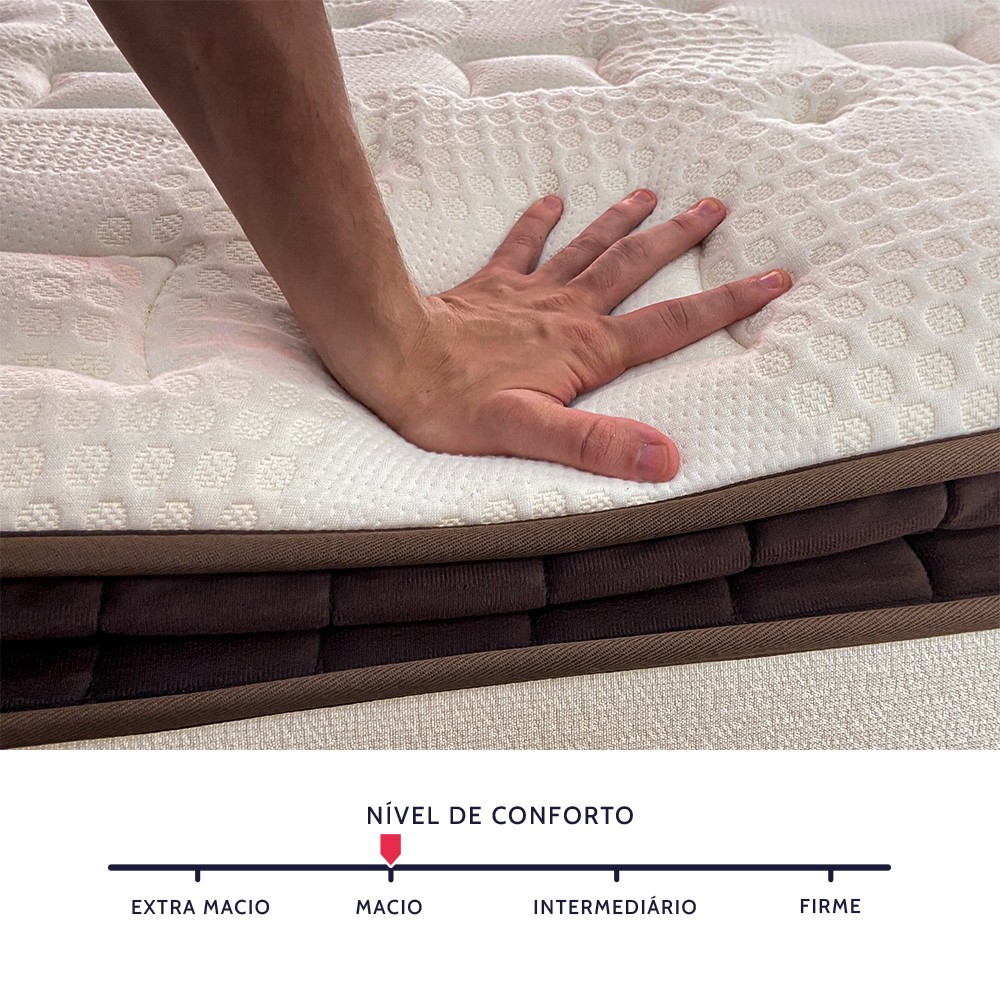 Por que escolher o BF Sensation? Sensação de hotel 5 estrelas: Porque dormir bem não precisa ser um privilégio de viagem – com o Sensation, sua casa vira o melhor destino de descanso. Espumas testadas e certificadas: Desenvolvido com espumas de alta tecnologia, certificadas pelo INER, garante durabilidade, suporte ideal e um descanso de qualidade superior. Custo-benefício: Conforto de alto padrão, com espumas premium e tecnologia avançada. Um investimento que vale cada noite bem dormida. Seu descanso merece esse upgrade. Conforto que abraça, suporte que sustenta: O BF Sensation combina um Pillow Top extra macio com molas ensacadas que dão suporte na medida certa, proporcionando conforto sem abrir mão do suporte ideal para a coluna. Nível de conforto segundo nossos clientes: “O colchão é elogiado por ser macio, confortável e muito bonito. A qualidade do produto impressiona e garante uma experiência de sono aconchegante. Conheça as camadas do seu colchão: Dupla camada de conforto O Pillow Top extra macio do BF Sensation combina duas espumas premium extra macias que proporcionam maciez e alta resiliência. Assim, você desfruta de um conforto macio e relaxante, sem abrir mão da ergonomia e do alinhamento da postura. Espuma Bf Hiper Soft® A espuma Hiper Soft que combina maciez e alta resiliência, proporcionando um toque suave e aconchegante, mas sem perder o suporte necessário. Sua estrutura permite que ela se adapte ao corpo de forma envolvente, aliviando pontos de pressão, mas retorne rapidamente ao formato original, garantindo durabilidade e conforto por muito mais tempo. Espuma Bf Viscoelástica® (NASA) A espuma viscoelástica da NASA se molda perfeitamente ao corpo, distribuindo a pressão de forma uniforme e aliviando tensões em áreas como ombros e quadril, ideal para um descanso profundo e restaurador. Molas ensacadas individualmente Dorme com alguém que se mexe muito? As molas ensacadas trabalham de forma independente e silenciosa, realizando o bloqueio de movimentos para um sono mais tranquilo e sem interrupções. Além disso, oferecem suporte ortopédico e um encaixe anatômico, mantendo a coluna alinhada e garantindo conforto com a sustentação ideal. Características: Medidas: 36cm x 193cm x 203cm (Altura x Largura x Comprimento); Suporte de Peso: Até 140 kg por pessoa Nível de Conforto: Macio Pillow Top Extra Macio: Combina as espumas Bf Hiper Soft® e Bf Viscoelástica® Camada de Sustentação: Molas Ensacadas Individualmente Revestimento: Malha Belga Hipoalergênica Garantia: 1 ano Marca: BF Colchões Quem é a BF Colchões? Para nós, dormir bem é a base de uma vida plena de sonhos e qualidade de vida. Com mais de 55 anos de experiência e mais de 900 colaboradores, somos pioneiros na venda online de colchões, nos tornando a marca mais vendida e bem avaliada da internet, melhorando a qualidade do sono de milhares de brasileiros. Cuidamos de toda a produção — desde a fabricação da espuma até o último detalhe — com design, engenharia e cuidado em cada colchão. Em nosso laboratório próprio, desenvolvemos e testamos todas as nossas espumas para entregar conforto, durabilidade e o melhor custo-benefício do mercado para garantir a satisfação de milhares de clientes em todo o país. Prazer, somos a BF Colchões. Atenção a entrega: Não fazemos entregas em estrada de terra, ou barco. Não subimos produtos por escadas e elevadores.