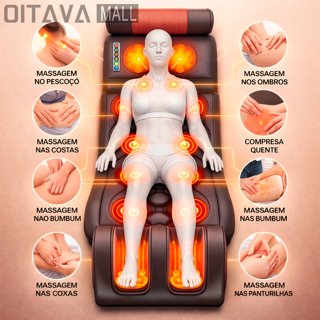 Transforme sua rotina de descanso em uma verdadeira experiência de spa sem sair de casa. O Colchão Massageador Completo com Shiatsu, aquecimento e airbag ajustável foi desenvolvido para proporcionar relaxamento profundo, alívio de dores musculares e mais conforto no dia a dia. Ideal para quem passa muitas horas sentado, trabalha sob pressão ou sofre com tensões nas costas, lombar e pescoço. PRINCIPAIS CARACTERÍSTICAS - Massagem Shiatsu Realista - Conta com 20 cabeças de massagem no travesseiro, em diferentes alturas, simulando técnicas reais de massagem para pescoço e ombros. - 10 Motores de Vibração Potentes Distribuídos estrategicamente para atuar em: - Ombros - Costas - Lombar - Quadris - Coxas - Panturrilhas - Airbag Ajustável para Tração Espinhal Sistema de airbag que eleva e acompanha as curvas do corpo, promovendo: - Alongamento suave da coluna - Redução da pressão lombar - Mais conforto durante a massagem - Aquecimento Terapêutico Calmante Aquecimento no pescoço e lombar com fibra de carbono, ajudando a: - Relaxar músculos tensos - Melhorar a circulação sanguínea - Aumentar a sensação de bem-estar - Controle Remoto Completo Permite ajustar facilmente: - Intensidade da massagem - Modos de vibração - Zonas de massagem - Altura do airbag - Tempo de uso - Função Timer Inteligente Desligamento automático programável em: - 10 minutos - 20 minutos - 30 minutos BENEFÍCIOS DO PRODUTO: - Alívio eficaz de dores musculares e tensões - Relaxamento profundo em poucos minutos - Auxilia na circulação sanguínea - Reduz o estresse e a fadiga do dia a dia - Ideal para uso em casa, no trabalho ou momentos de descanso ESPECIFICAÇÕES TÉCNICAS: - Modos de massagem: - 9 níveis de intensidade - 10 modos de vibração - Motores: 10 motores vibratórios + 20 cabeças Shiatsu - Material: Couro sintético de alta qualidade e tecido confortável - Potência: 36W - Tensão: 12V - Voltagem: Bivolt (110V / 220V) - Design: Ergonômico e dobrável - Fácil de armazenar e transportar ITENS INCLUSOS: - 1 Colchão Massageador Completo - 1 Controle Remoto - 1 Manual de Instruções PERGUNTAS FREQUENTES: O colchão é dobrável? - Sim. Ele pode ser dobrado, facilitando o armazenamento e transporte. Possui desligamento automático? - Sim. Conta com timer programável para 10, 20 ou 30 minutos.