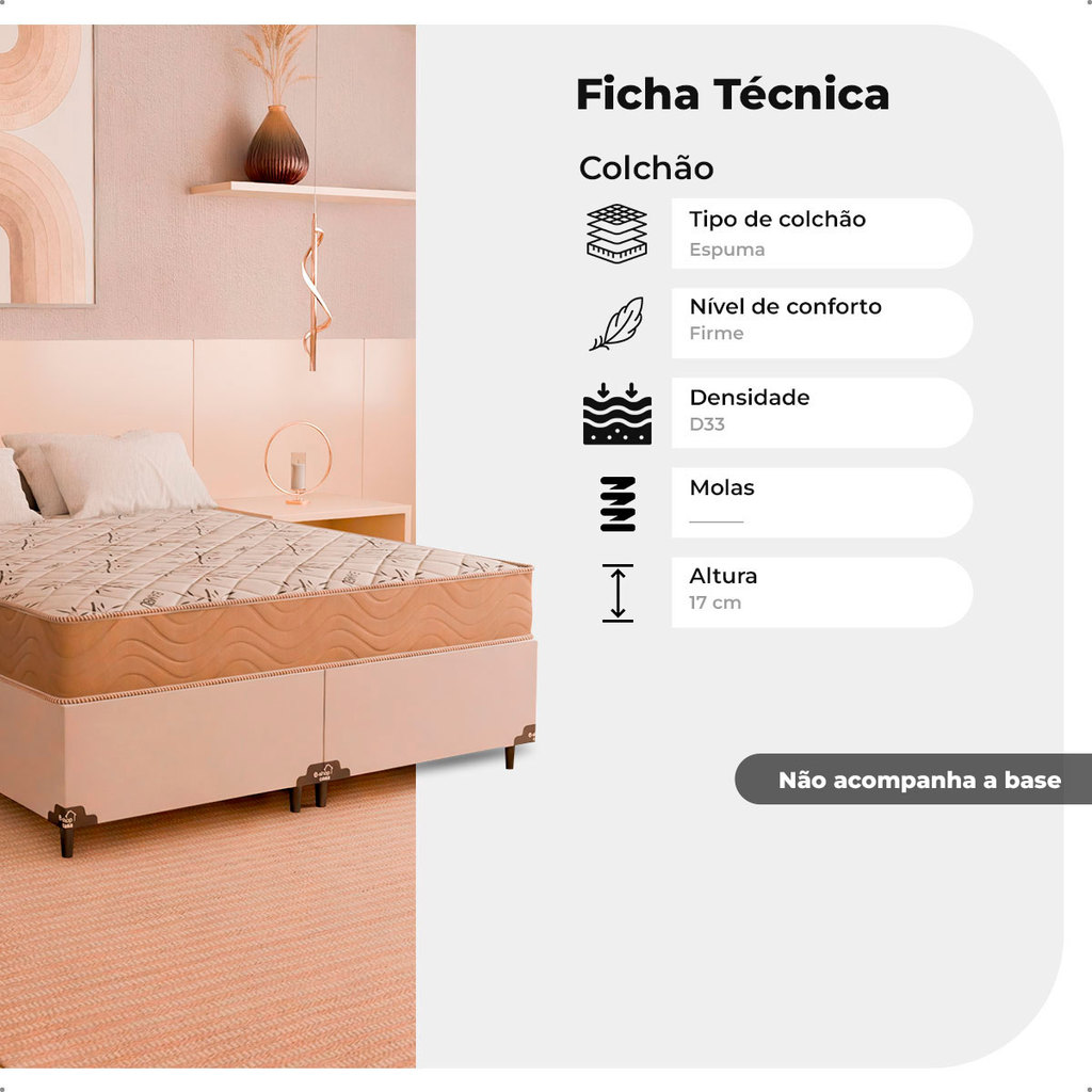 O ColchãoQueenD33 é a melhor opção para você que procura qualidade na hora do descanso. Fabricado com espuma D33, que é considera um dos melhores materiais da categoria de espumas em densidade e conforto, proporciona uma melhor noite de sono. Possui sistema One Face, onde você utiliza apenas um lado do colchão, não sendo necessário virar, apenas girar e possui eps em sua estrutura que proporciona uma maior firmeza do produto. Adquira e tenha noites confortáveis e tranquilas! Colchão Queen D33 One Face- 17x158x198cm - Suede Bege INFORMAÇÕES COLCHÃO: -Tecido de revestimento: Poliéster Bordado - Cor: Branco c/ Lateral em SuedeBege - Modelo: Queen One Face (uma face) - Dimensão: 0,17x1,58x1,98 - Peso limite: 120 kg por pessoa - Peso do produto: 8 kg - Material de estrutura: Espuma D33/EPS - Tipo de conforto: Intermediário Garantia de 3 meses válida para defeitos de fabricação. Obs.: Os entregadores têm permissão para subir até o terceiro andar utilizando escadas e podem utilizar elevadores para realizar entregas em condomínios, seguindo as diretrizes de segurança estabelecidas. No entanto, é importante ressaltar que eles (motoristas/entregadores) não estão autorizados a entrar nas residências de clientes, limitando-se apenas à entrega no local designado. A e-Shop Casa não cobra valor excedente do cliente no ato da entrega.