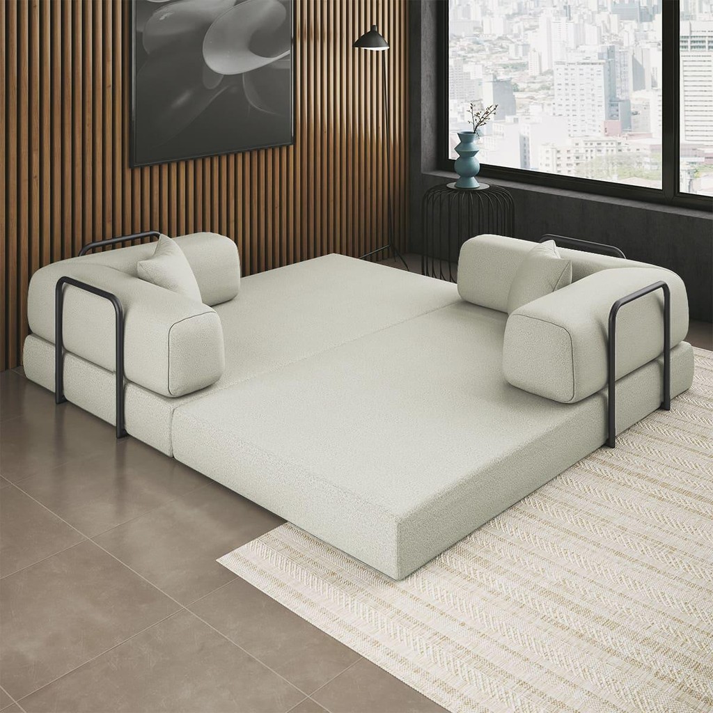 O Sofá Cama Casal Compactair é a solução perfeita para quem busca praticidade, conforto e design inteligente. Com tecnologia de compactação a vácuo, ele vem embalado em caixa, facilitando o transporte e a montagem em qualquer ambiente. Seu formato permite usar como sofá ou cama, sendo ideal para apartamentos, salas, quartos, studios e espaços multifuncionais. O visual moderno e prático transforma qualquer cômodo com estilo e versatilidade. Compacto no tamanho, gigante em benefícios. Especificações do produto - Tecido em Bouclê - Estrutura em metal preto - Almofadas ILUSTRATIVAS, ou seja, NÃO INCLUSAS - Espuma de densidade D-28 - Enchimento do encosto em fibra siliconada Informações Técnicas - Altura: 65 cm - Largura: 188 cm - Profundidade: 88 cm - Peso: 36 kg Capacidade de Suporte: O produto suporta até 400 kg Produto embalado - Altura: 97 cm - Largura: 46 cm - Profundidade: 81 cm - Peso: 36 kg Observações Importantes - O produto leva em torno de 1 dia para a espuma se encher por completo, devido à compressão da embalagem - O produto tem 3 meses de garantia contra defeitos de fabricação - Produto possui uma embalagem segura, feita para evitar danos durante o transporte - O Produto é entregue com a sua estrutura montada, apenas com a base de metal para finalizar o encaixe; - A cor real pode variar ligeiramente devido às configurações da tela e ao tratamento das imagens - O Prazo de envio é de 7 dias úteis após a confirmação da compra e enviamos para todo o Brasil - Não nos responsabilizamos por subida de escada no ato da entrega Perguntas Frequentes Como devo limpar? - Realizar a limpeza do tecido com um pano seco ou levemente umedecido Quantos produtos irei receber nesta compra? - Você receberá 1 volume, ou seja, apenas um Sofá Cama. - Almofadas somente ilustrativas, não inclusas no item. Para mais informações ou assistência com sua compra, nossa equipe está à disposição para ajudar