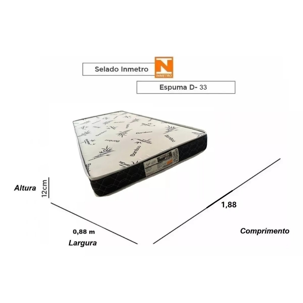 - Descrição do Colchão: • Colchão 100% Espuma, pode ser usado dos dois lados Certificado e Selado pelo INMETRO • Tamanho: Solteiro • Comprimento: 188 cm • Largura: 78 cm • Altura: 12 cm • Marca: Sensor • Linha: Espuma • Densidade: D33 • Tecido: Poliéster de alta qualidade bordado • Tratamento no tecido: Antialérgico, Antiácaro e Antimofo • Biotipo: Suporta até 120 kg • Composição: Espuma / Tecido • Dupla Face: Sim
