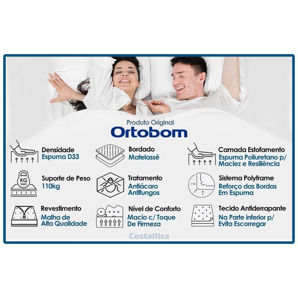 Colchão Solteiro Espuma D33 Light (88x188x14) - Ortobom Marca: Ortobom Dimensões(Cm): Comprimento(Profundidade): 188cm x Largura: 88cm x Altura: 14cm Vantagens Extras de Colchão - Ecologicamente Correto Tecido com Tratamento do Colchão - AntiÁcaro e AntiFungo Bordado do Revestimento do Colchão - Matelassê Forração Revestimento do Colchão - Bordado de Alta Qualidade Tecido de Revestimento da Faixa Lateral do Colchão - Poliéster Modo de Utilização do Colchão - Double Side Camadas Interna do Estofamento de Espuma do Colchão - Alta Qualidade Tipo de Espuma do Colchão - Espuma de Poliol Vegetal Densidade da Espuma do Colchão - D33 Nível de Firmeza do Colchão - Macio c/ Firmeza Peso Máximo Suportado do Colchão - 110 kg Certificação de Qualidade do Colchão - Qualidade Aprovada - INMETRO Nossa Avaliação do Colchão - Qualidade Excelente Tempo de Garantia do Colchão - Certificado de Garantia Digital - 24 meses Imagens Meramente Ilustrativas. Não nos responsabilizamos pela montagem/instalação dos produtos. Todas as informações divulgadas são de responsabilidade exclusiva do fabricante/fornecedor. -Verifique com os fabricantes do produto e de seus componentes eventuais limitações à utilização de todos os recursos e funcionalidades - Confira as dimensões do produto e analise se irão passar normalmente por elevadores, portas, escadas e corredores, pois não nos responsabilizamos caso o produto necessite durante a entrega de: Desmontagem, subir escadas ou ser transportado por guincho, cordas para apartamentos. A entrega limita-se ao descarregamento em local que tenha e ofereça total facilidade de acesso normal; - Só fazemos entregas por transportes rodoviários. Não realizamos entregas por transportes fluviais, aéreos e outros diferente de rodoviário. Não realizamos entregas na região norte: Amapá, Amazonas, Pará, Roraima e Acre; - Temos áreas com restrição e dificuldades que os transportadores rodoviários não atendem. Área de difícil acesso, área de risco, área rural, áreas fluviais, estradas não pavimentadas; - Sendo assim, caso seu endereço esteja em área restrita de entrega, a retirada de sua compra deverá ser realizada no CD do transportador ou indicar no momento da compra um endereço entrega fora da área restrita; - Caso realize pedido com entregas em locais de difícil acesso ou áreas com restrição e dificuldades que os transportadores e proprio correios não atendem, a compra sera cancelada pela Costa Rica Colchões, com a devida comunicação e estorno do pagamento ao cliente.